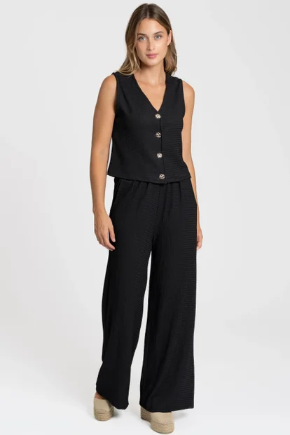 Conjunto de chaleco y pantalón. Chaleco cuello pico. Manga sisa. Cierre botones. Pantalón fluido. Cintura alta. Bolsillos laterales. Disponible en varios colores.