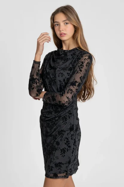 Tejido de encaje forrado. Cuello redondo. Manga larga. Diseño corto.