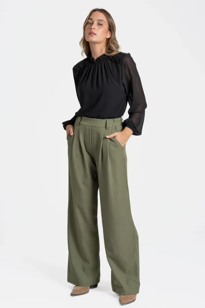 Tejido fluido. Cintura elástica. Tiro alto. Bolsillos laterales. Pernera ancha. Tablillas.