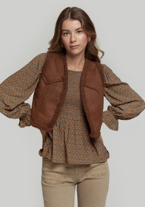 Tejido combinado. Diseño entallado. Diseño corto. Cuello redondo. Manga sisa. Abierto. Forrado de borreguito. Talla modelo: S.