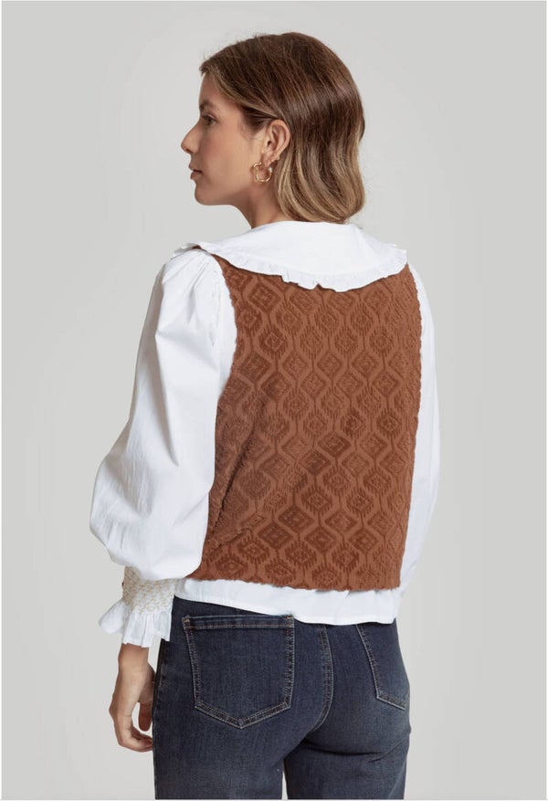 Tejido mezcla de algodón. Diseño estampado con textura. Diseño entallado. Diseño corto. Manga sisa. Abierto. Forrado. Talla modelo: S. Altura modelo: 1,70 m.