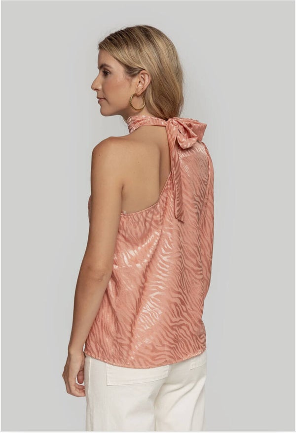 Tejido satinado. Diseño estampado. Diseño recto. Cuello halter con lazada. Manga asimétrica. Manga larga. Talla modelo: S.