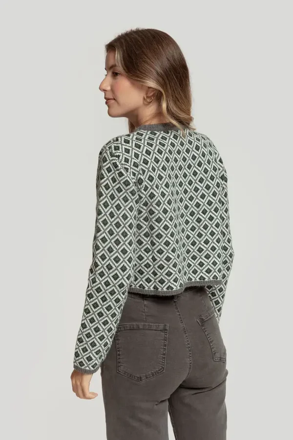 Tejido de punto. Punto grueso. Diseño estampado. Diseño recto. Diseño cropped. Cuello redondo. Manga larga. Talla única. Recomendamos talla S y M.