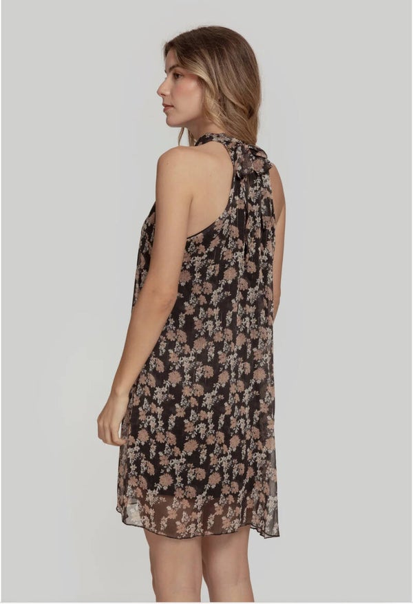 Tejido gasa. Tejido brillo. Diseño estampado. Diseño corto. Diseño recto. Cuello halter. Cuello anudado. Forrado. Talla modelo: S.