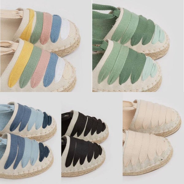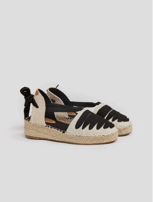 Diseño atado. Cuña esparto. Punta redondeada. Flat. Costuras visibles. Altura tacón: 3 cm