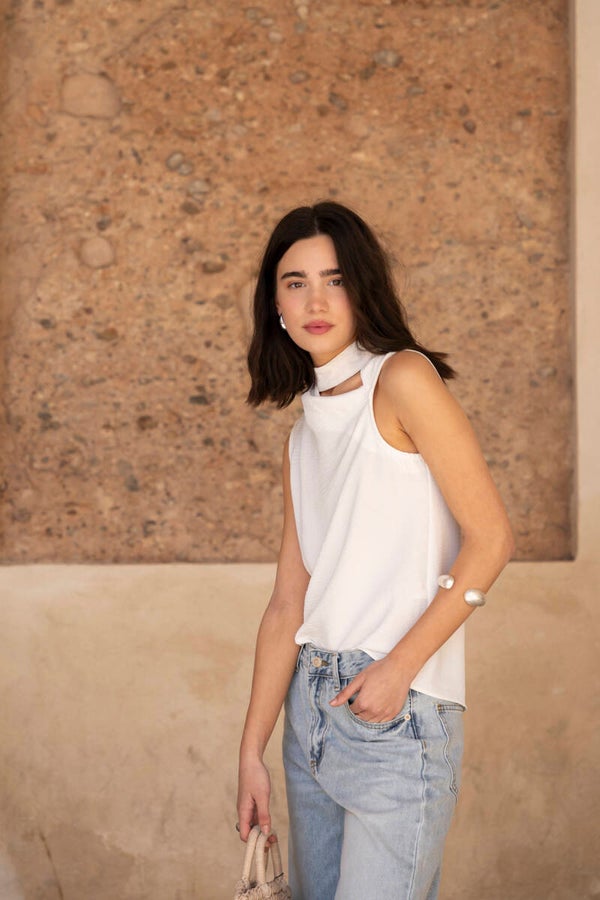 Tejido fluido. Escote cut out. Corte recto, sin mangas. Color crudo.
