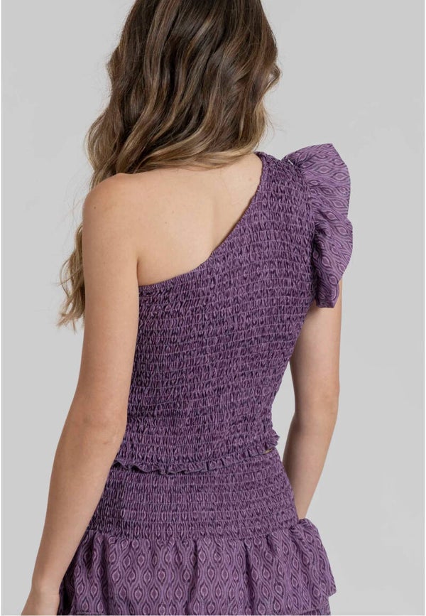 Tejido gasa. Tejido brillo. Diseño estampado. Diseño crop. Cuerpo nido. Manga asimétrica. Tira en cuello. Talla modelo: S.