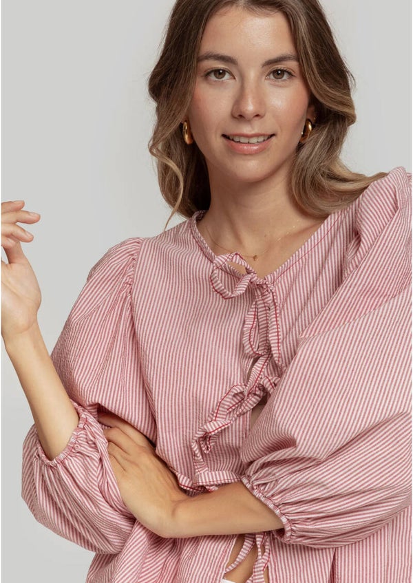 Tejido mezcla de algodón. Diseño estampado. Diseño oversize. Diseño fluido. Cuello redondo. Manga larga. Manga abullonada. Cierre lazos.