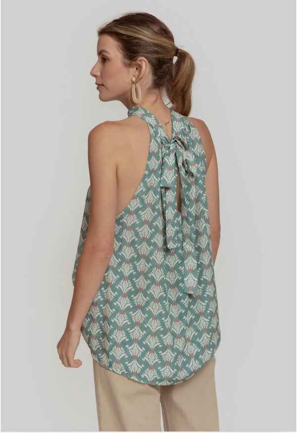 Tejido fluido. Diseño estampado. Diseño amplio. Cuello halter. Lazo posterior en el cuello. Talla modelo: S. Altura modelo: 1,70 m.