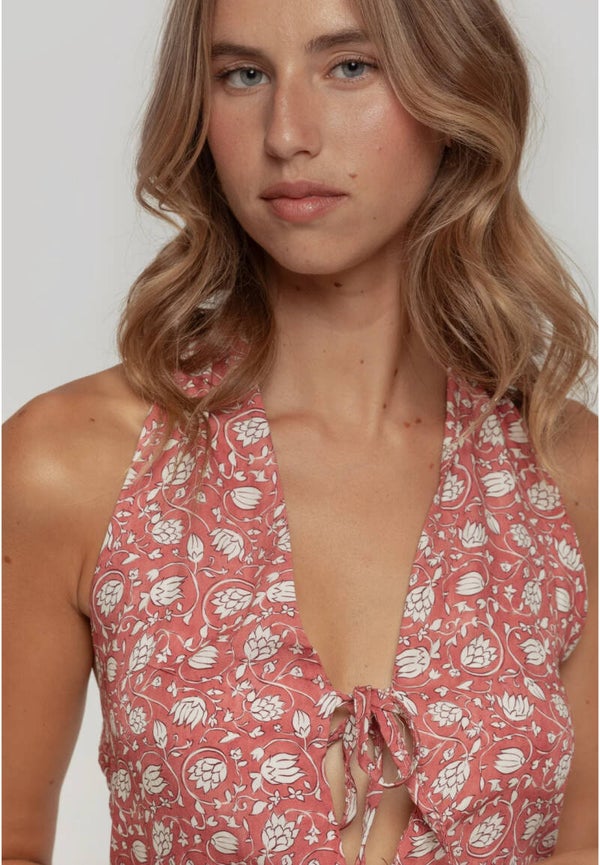 Tejido fluido. Diseño estampado. Cuello halter. Cierre de lazos. Anudado al cuello. Espalda elástica.