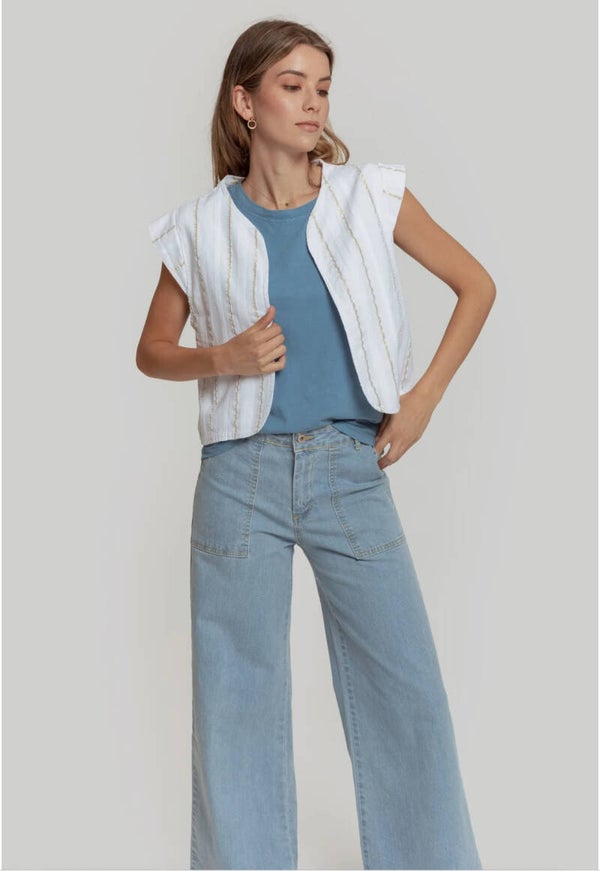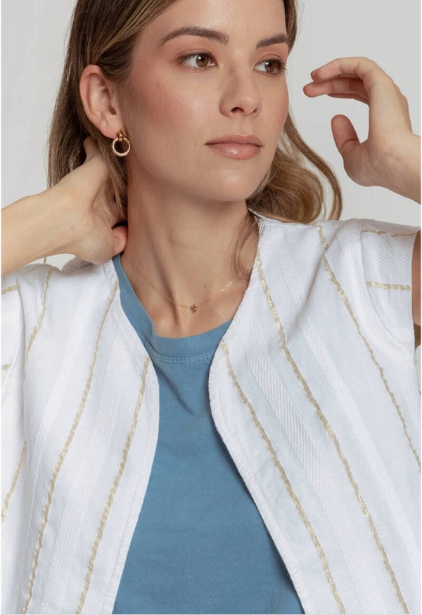 Tejido mezcla de algodón. Diseño estampado. Diseño recto. Cuello redondo. Manga sisa. Trama brillante. Talla modelo: S. Altura modelo 1,70 m.