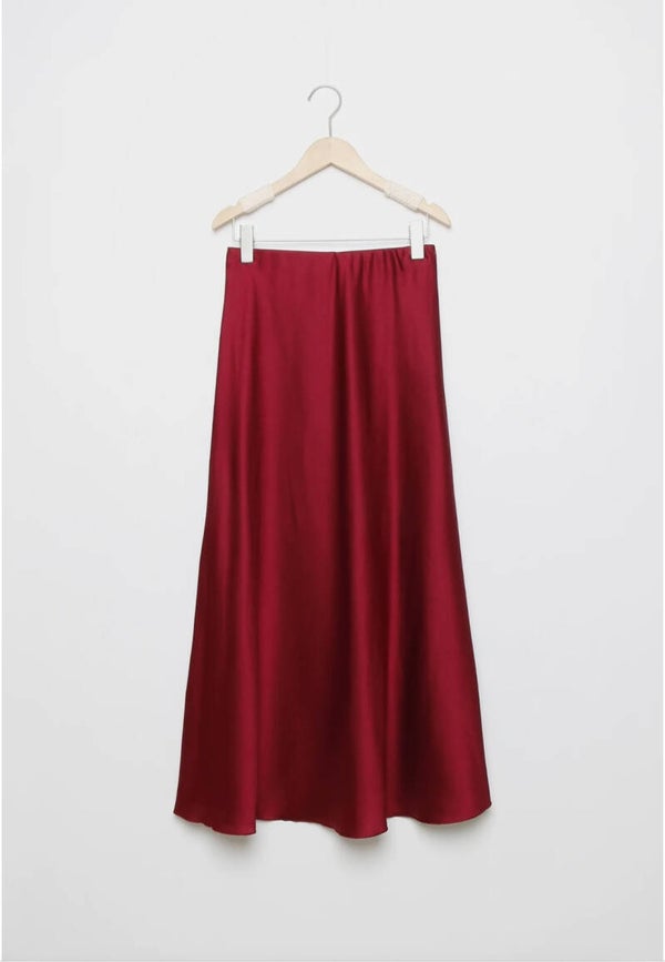 Tejido satinado. Diseño ajustado. Diseño largo. Corte evasé. Cintura elástica.