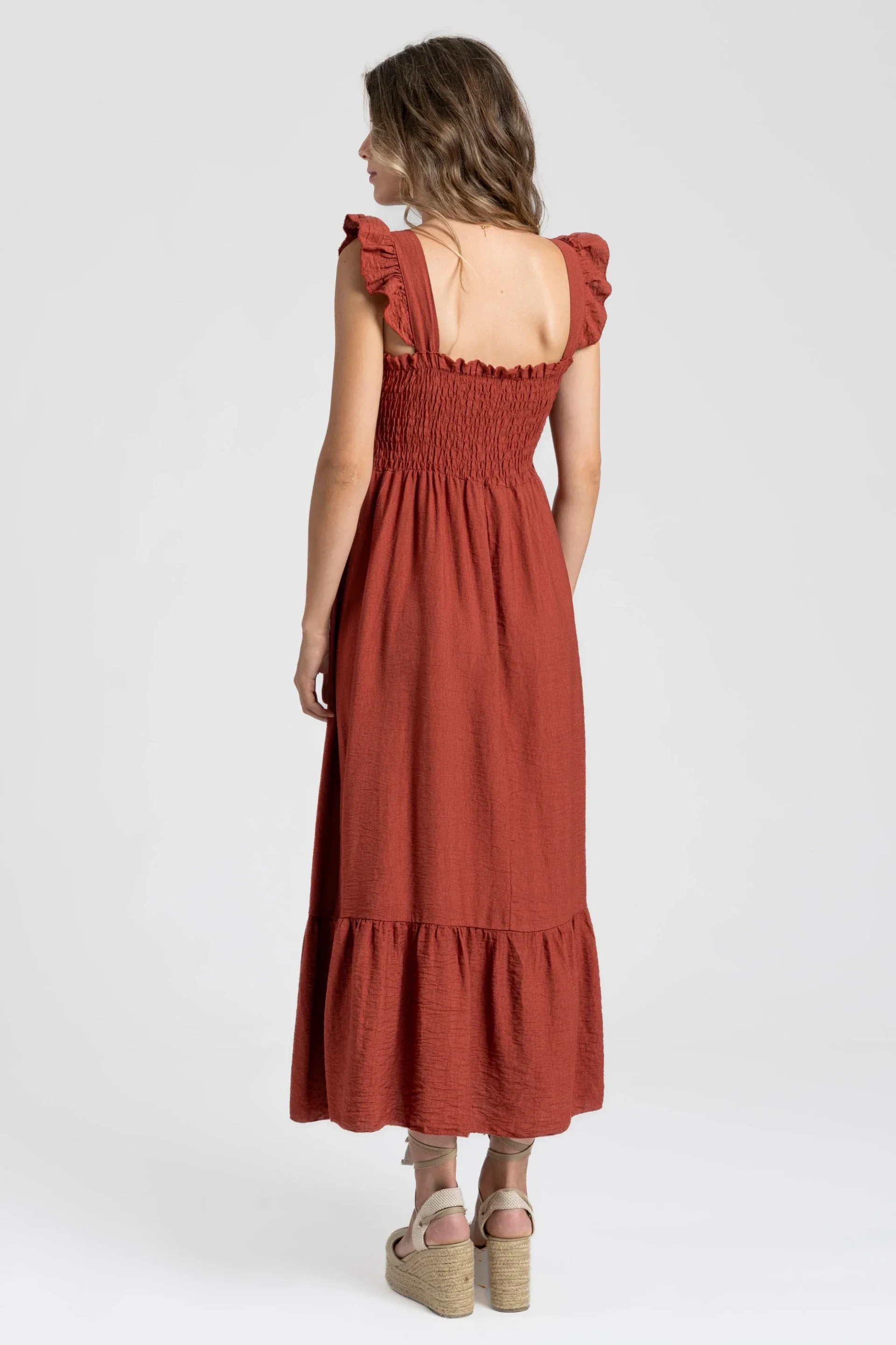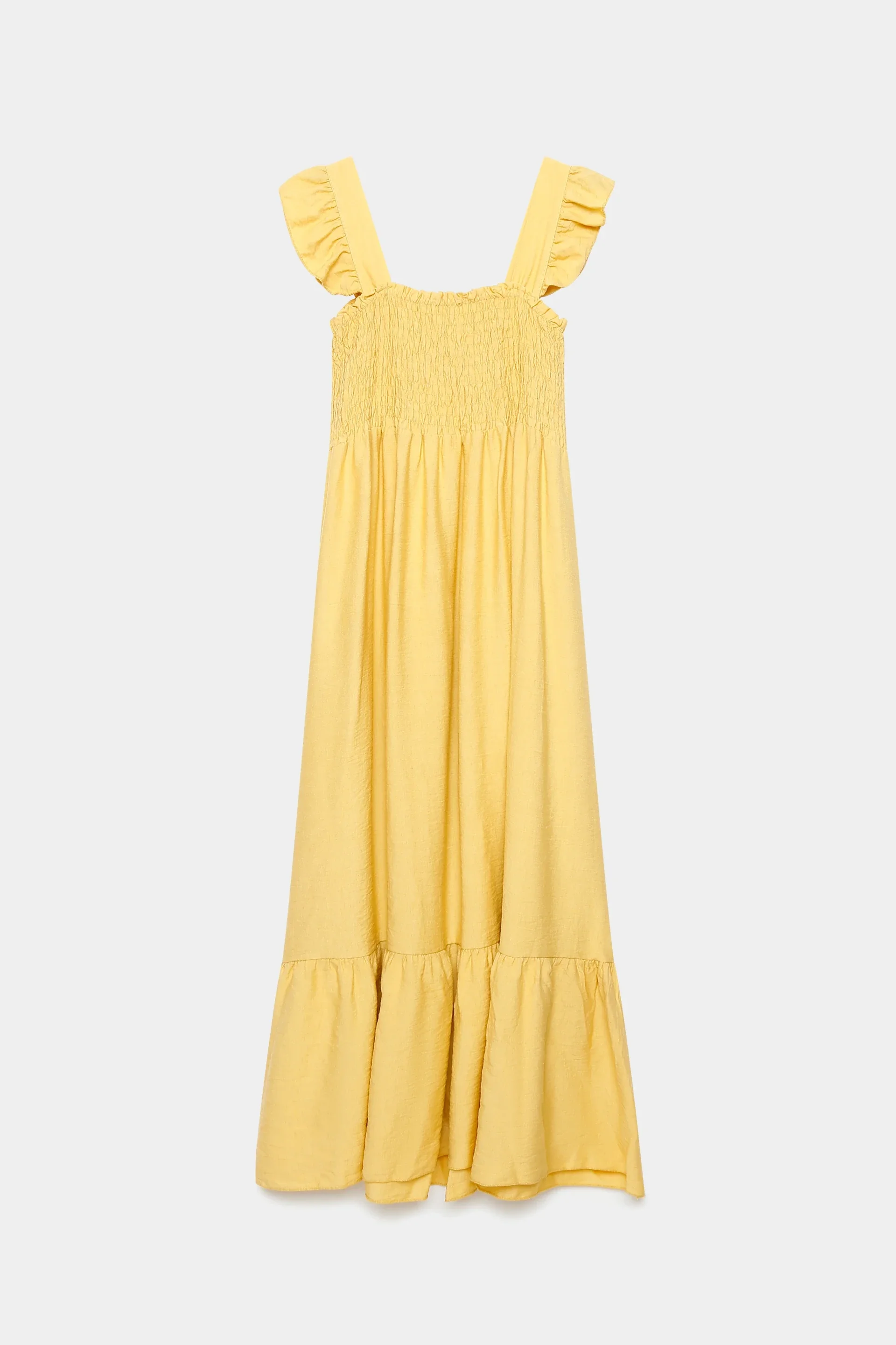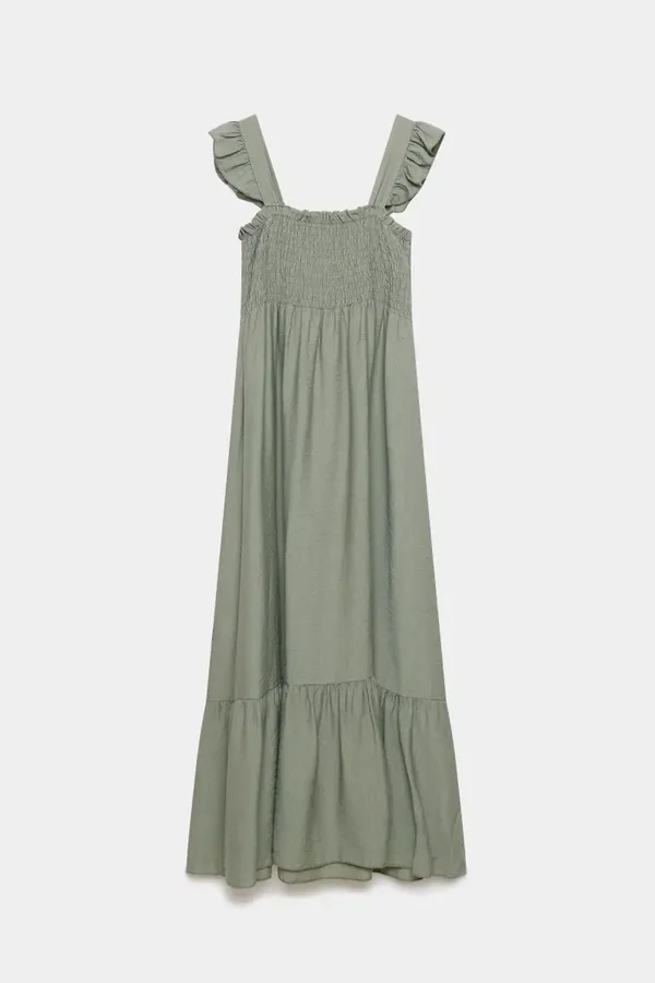 Tejido fluido. Diseño evasé. Diseño largo. Escote cuadrado.