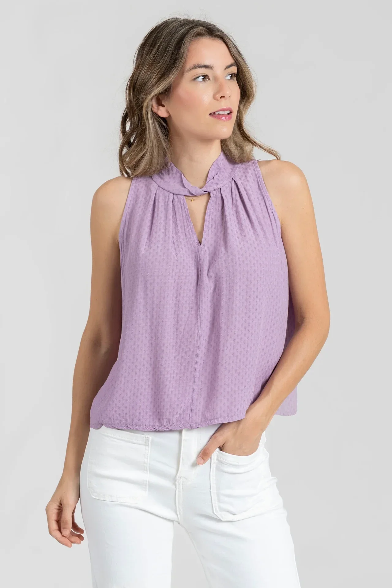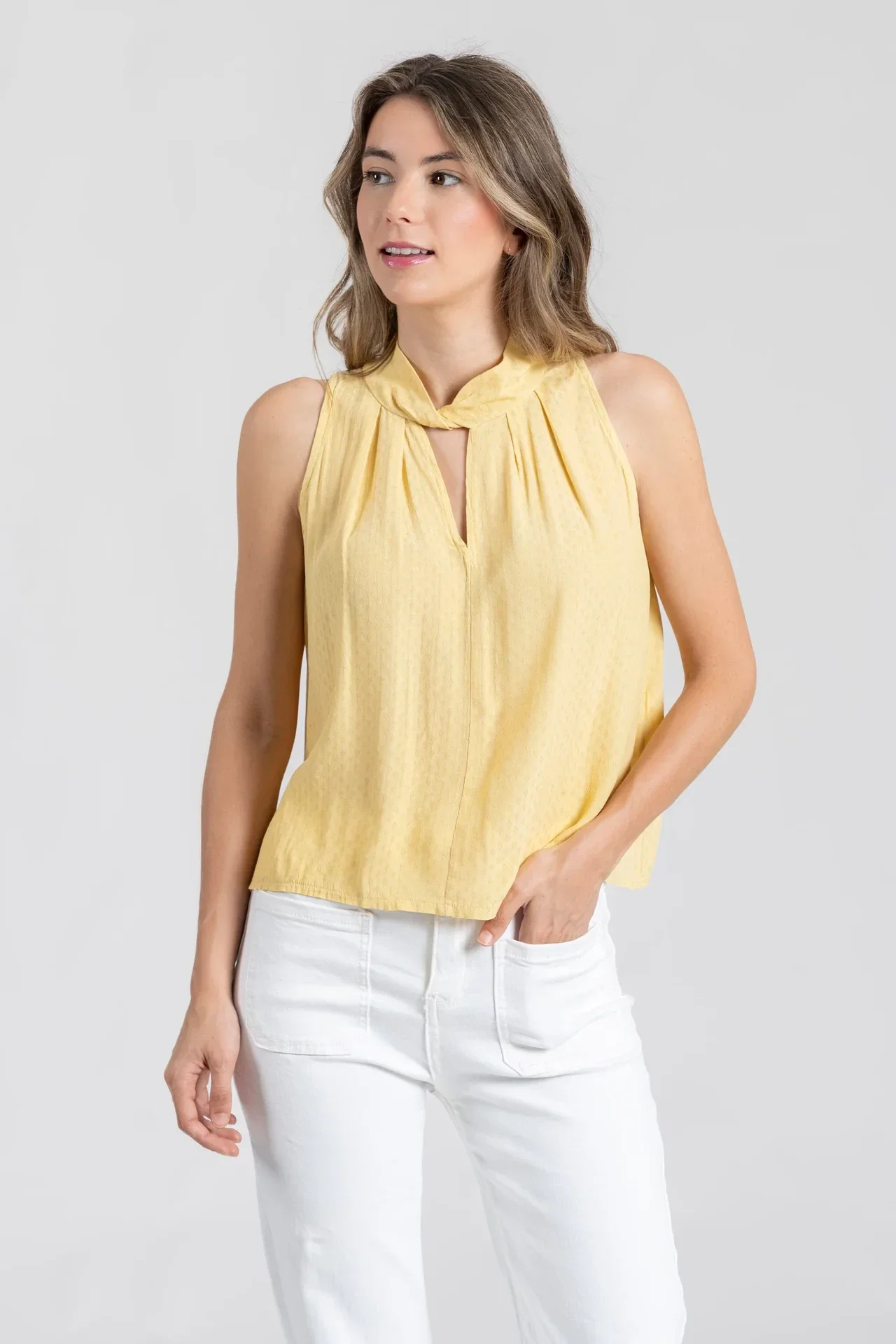 Tejido fluido. Tejido hilos. Escote halter. Manga sisa. Abotonado en la nuca. Talla S. Altura modelo: 1.70 m