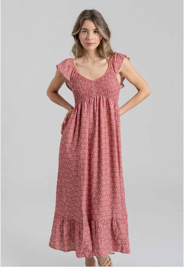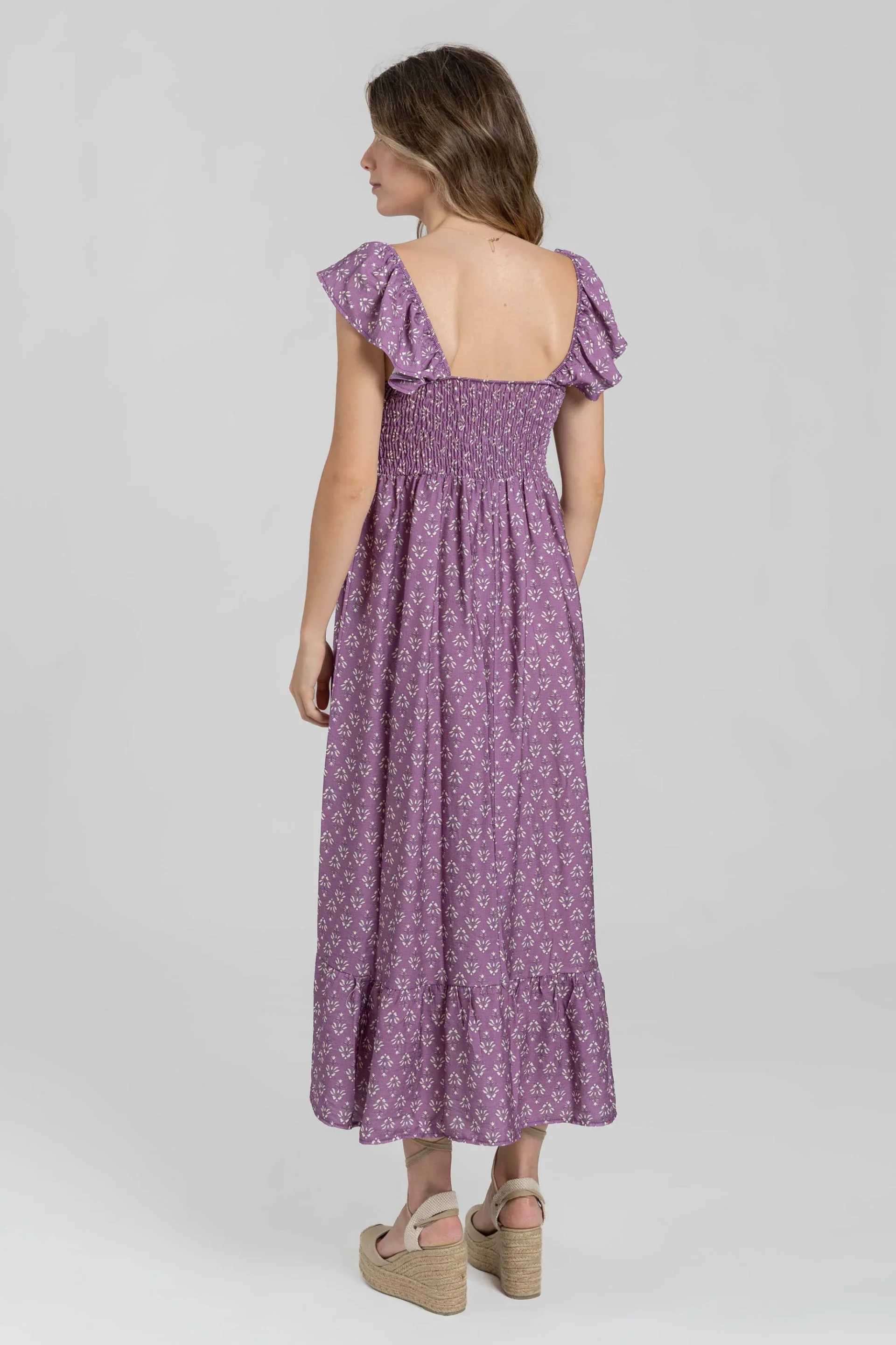 Tejido fluido. Diseño estampado. Diseño evasé. Diseño largo. Escote pico. Manga corta. Detalle volante. Talla S. Altura modelo: 1.70 m