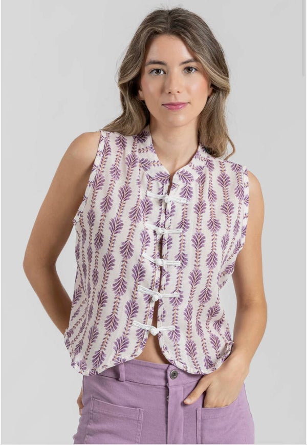 Tejido fluido. Diseño estampado. Diseño recto. Cuello redondo. Manga sisa. Hombros estructurados. Con cierre. Talla modelo: S. Altura modelo 1,70 m.