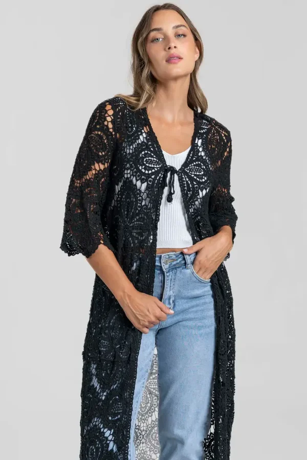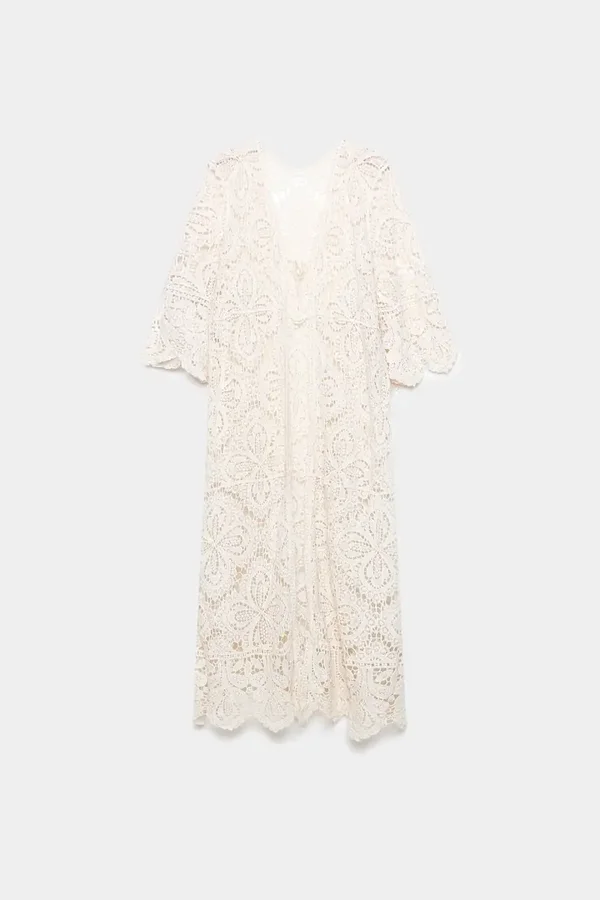 Tejido algodón y calado. Diseño largo. Manga campana. Talla única. Altura modelo: 1,66 m.
