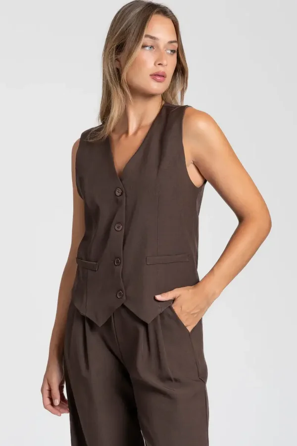 Conjunto de chaleco y pantalón. Chaleco cuello pico. Manga sisa. Cierre botones. Pantalón fluido. Cintura alta. Bolsillos laterales. Disponible en varios colores.