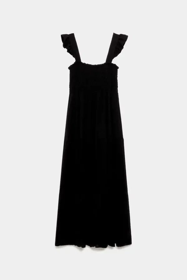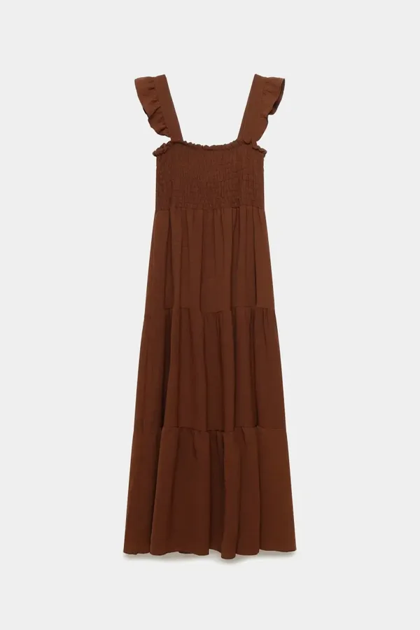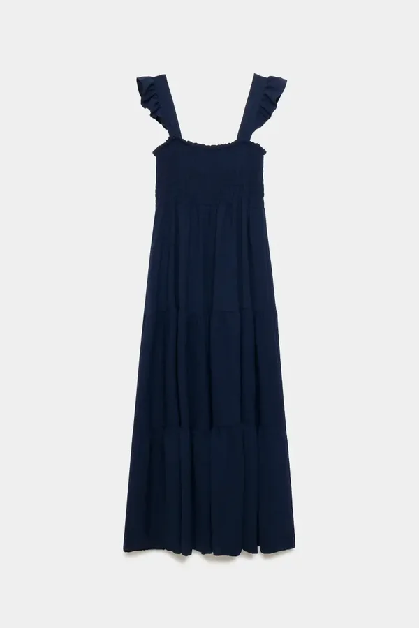 Tejido fluido. Diseño evasé. Diseño largo. Escote cuadrado.