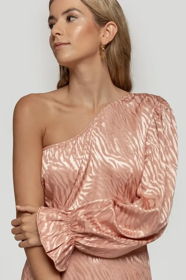 Tejido satinado. Diseño estampado. Diseño largo. Diseño recto. Cuello asimétrico. M Abertura lateral. Detalle cut out. Talla modelo: S. Altura modelo 1,70 m.
