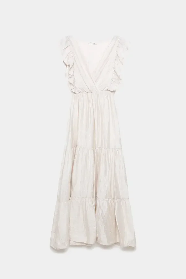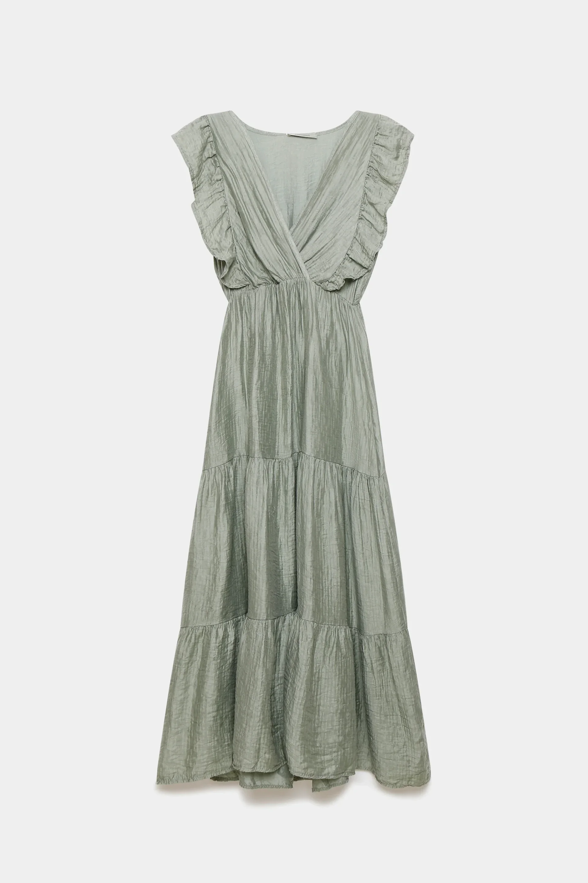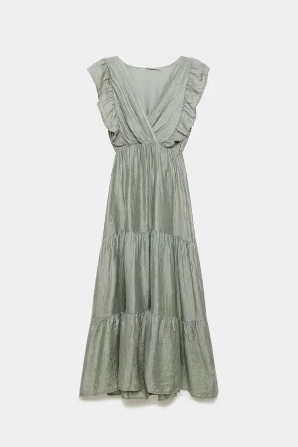 Tejido fluido. Escote pico. Manga sisa. Diseño largo.