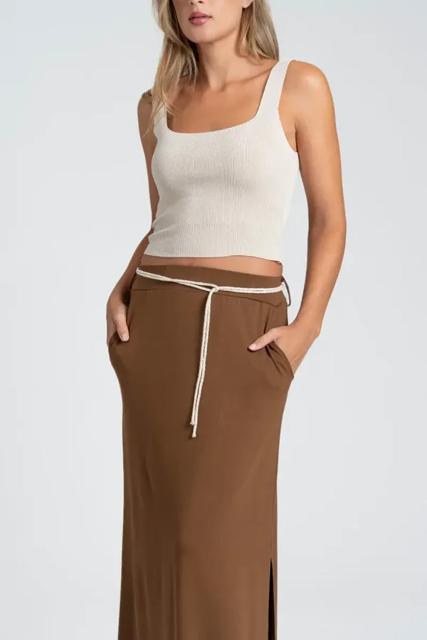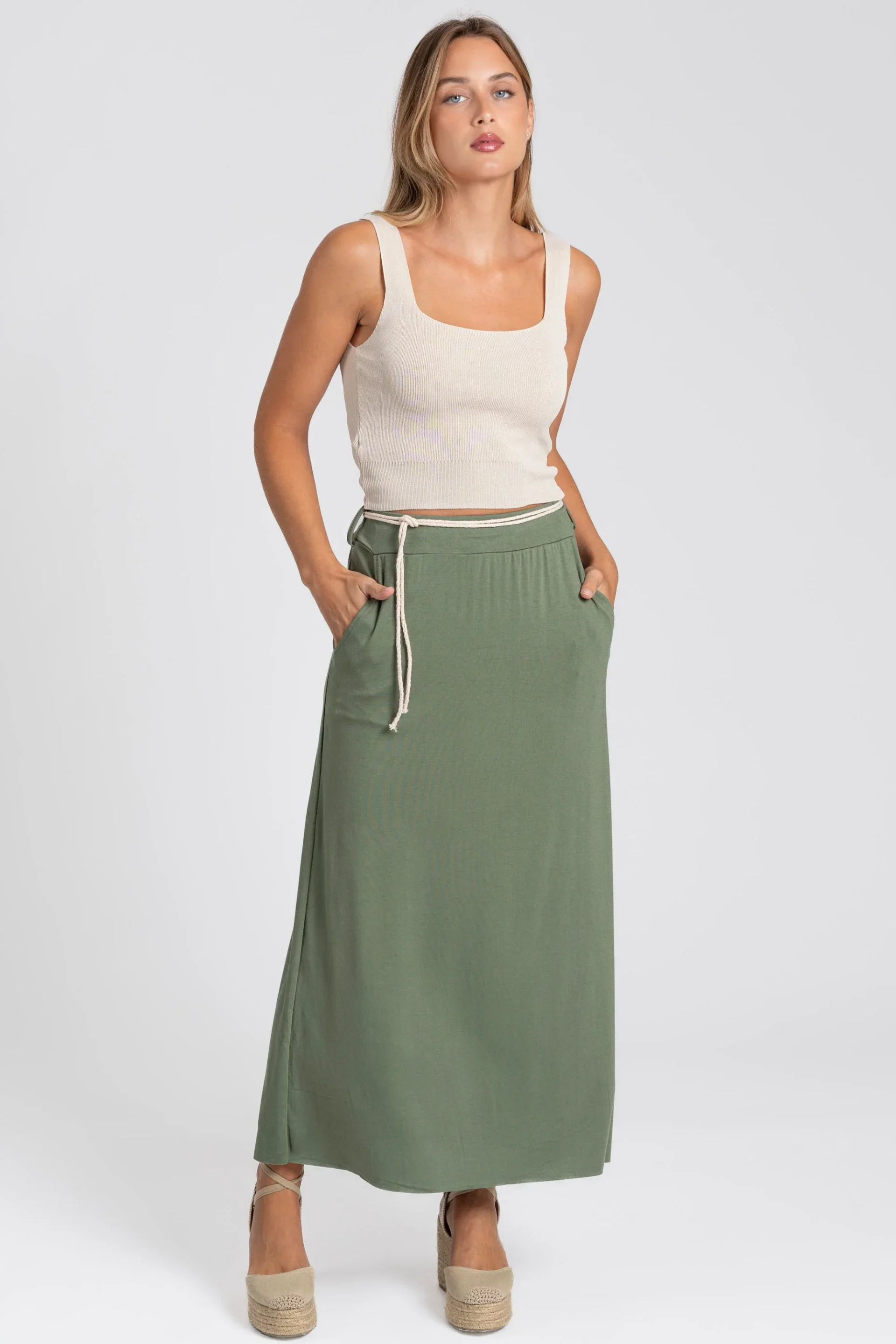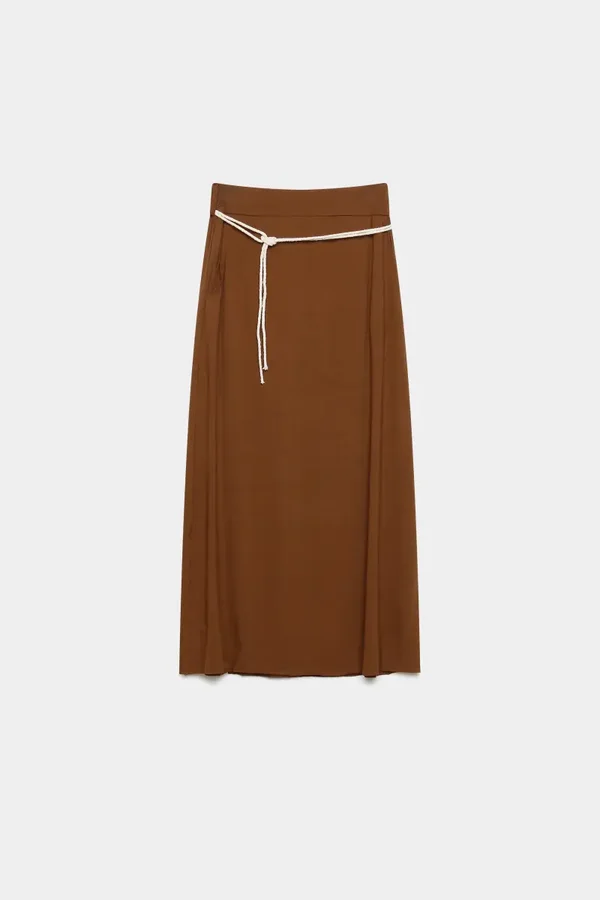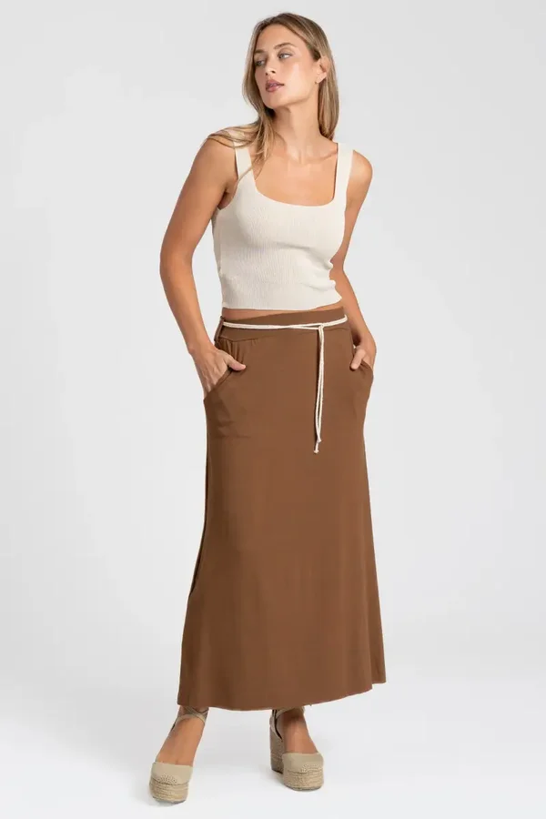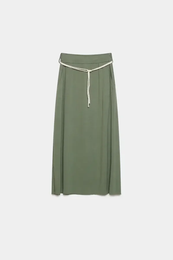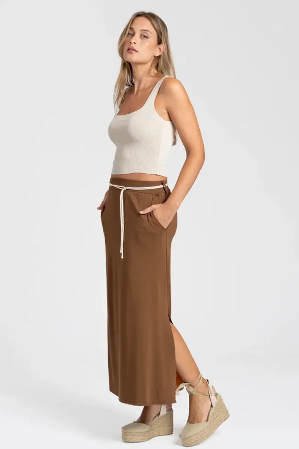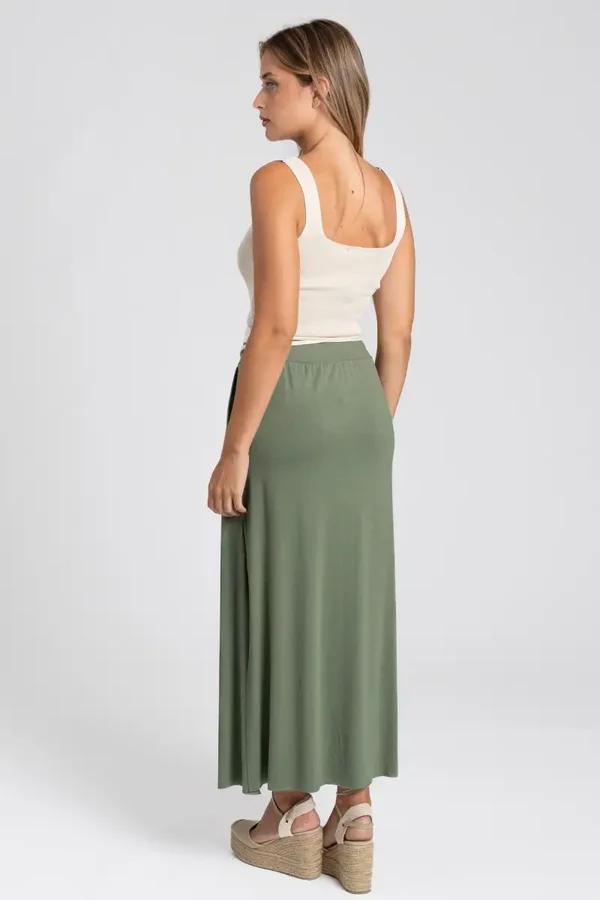 Tejido fluido. Cintura elástica. Bolsillos laterales. Apertura lateral.
