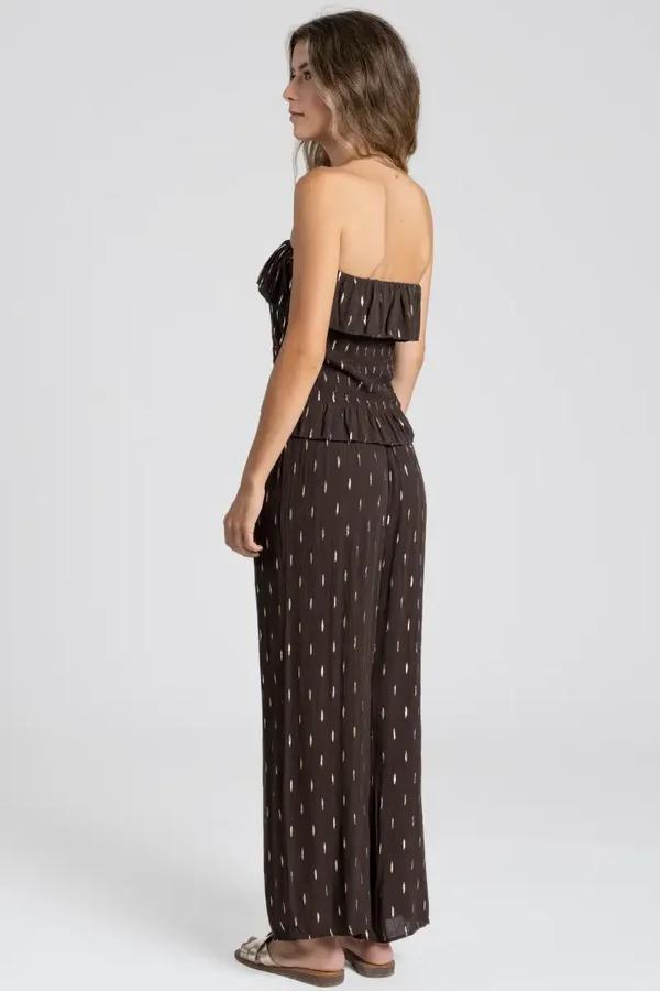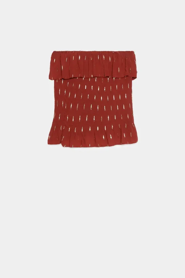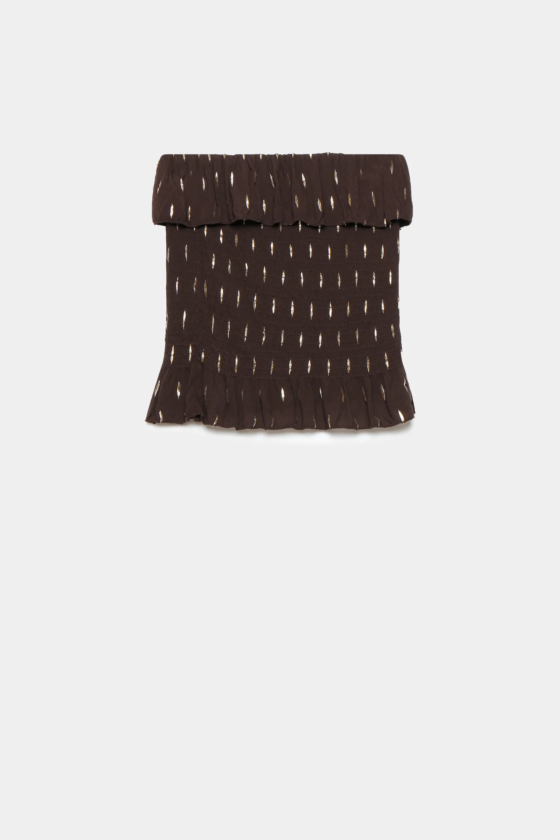 Tejido fluido. Diseño nido de abeja. Escote palabra de honor. Estampado brillo.