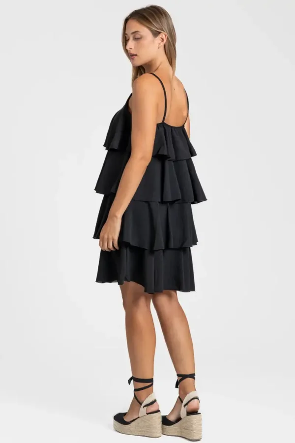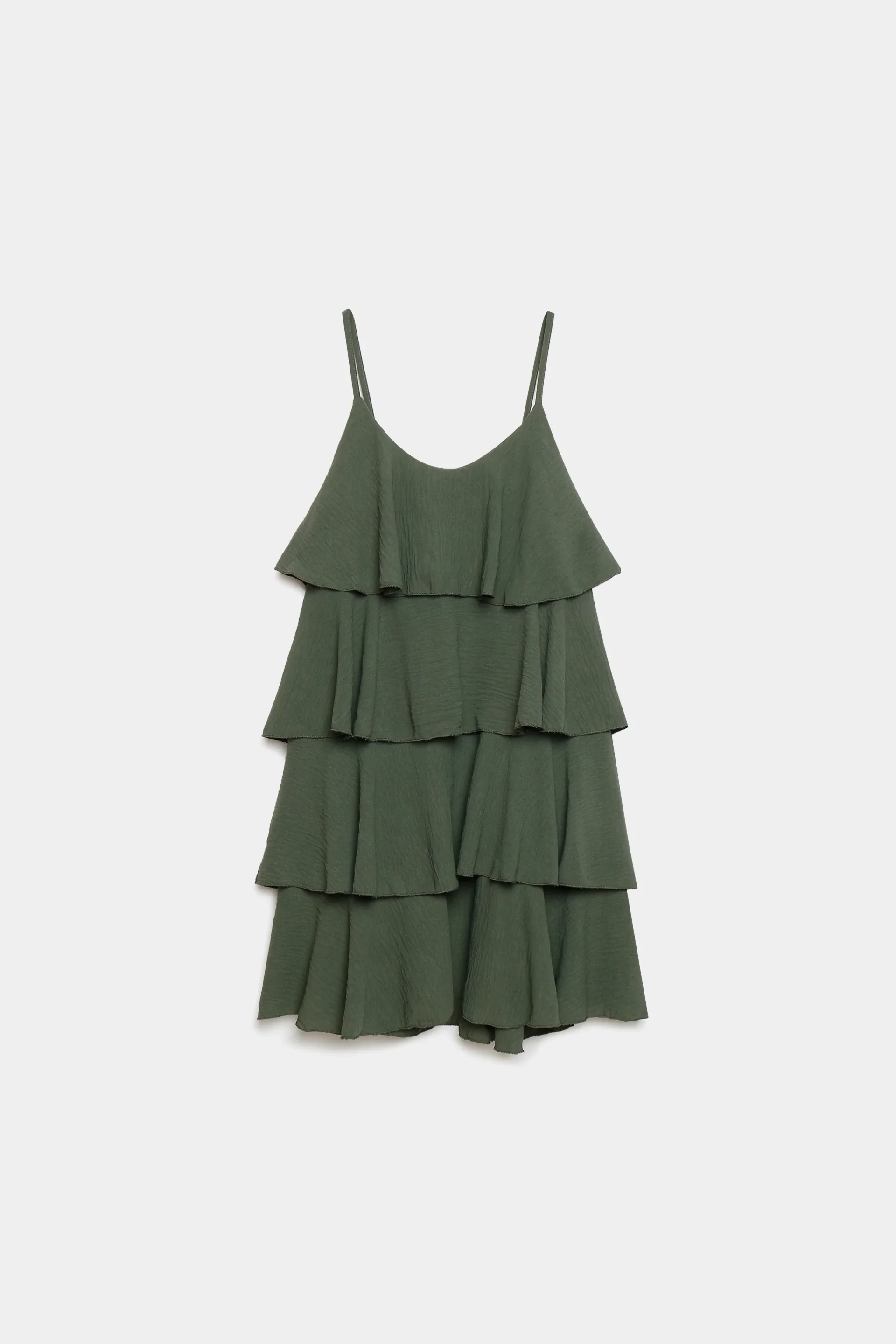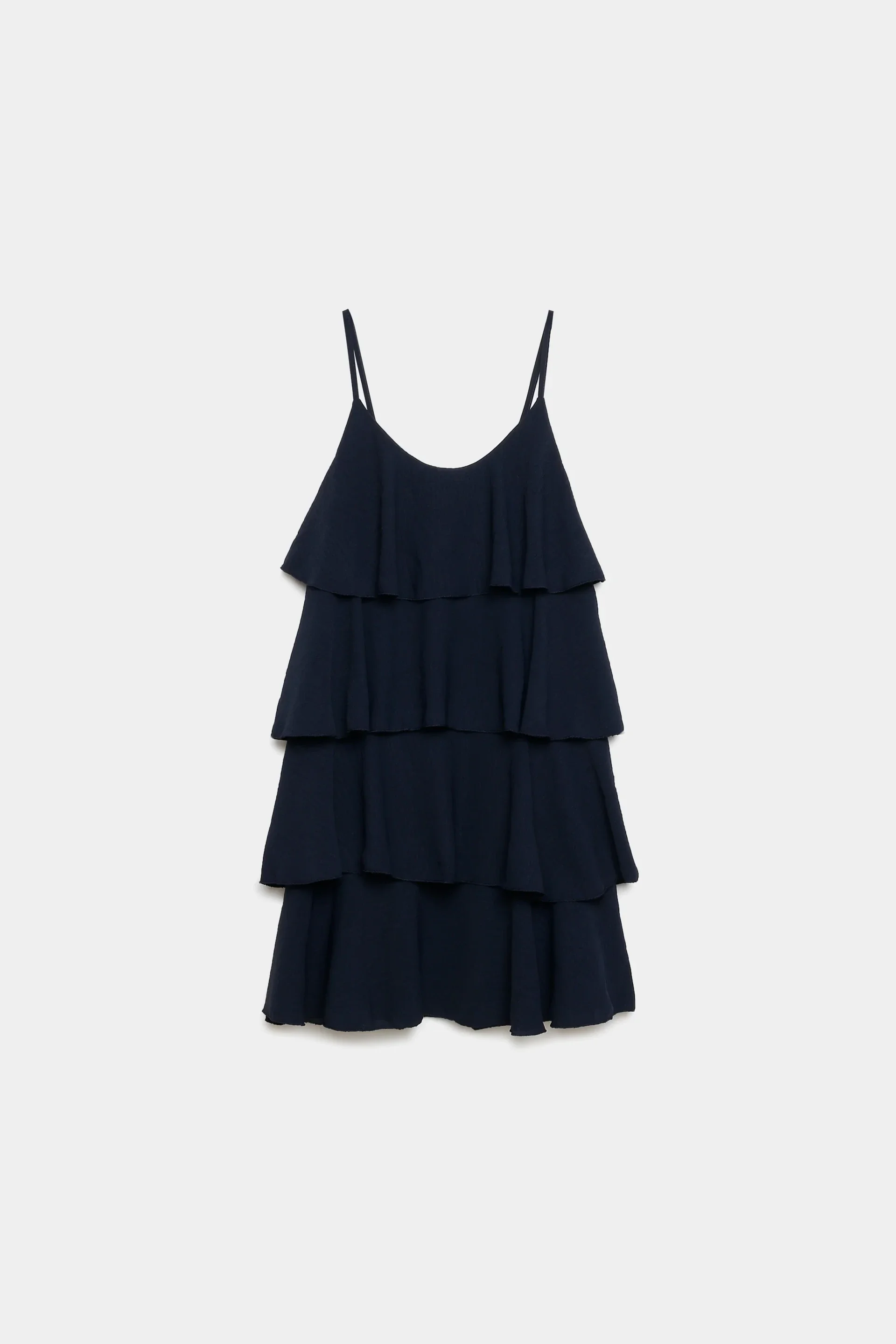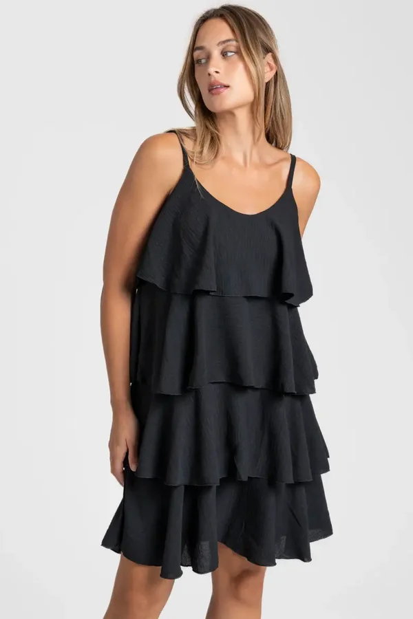 Tejido fluido. Tirantes finos. Escote redondo. Diseño capas.