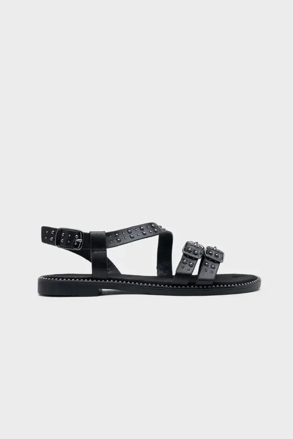 Sandalia tejido polipiel. Cierre de hebilla. Diseño de tiras ajustables. Suela plana y antideslizante.