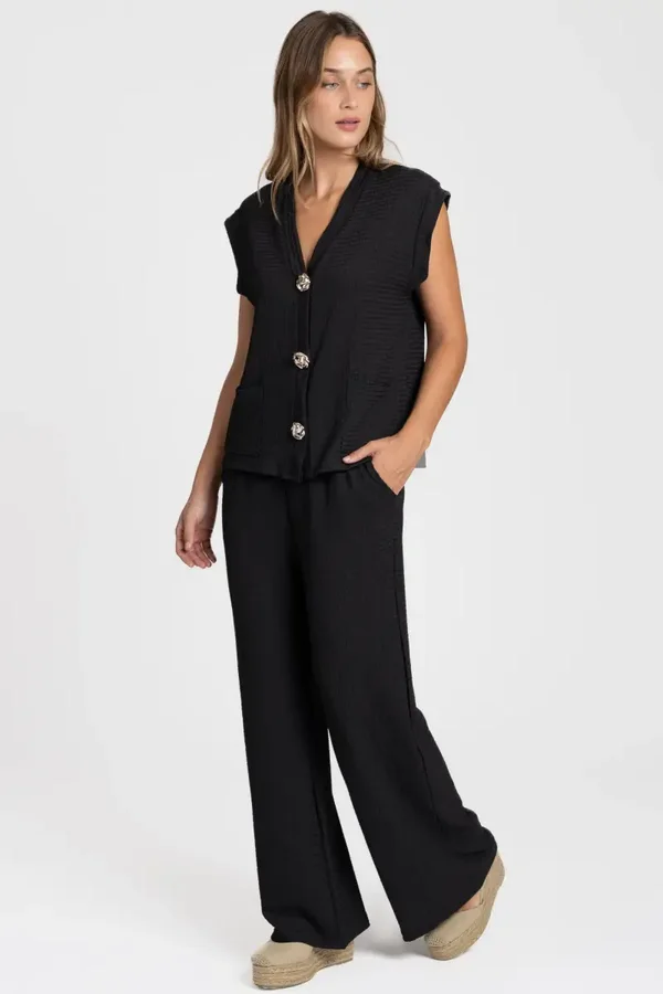 Tejido textura fluido. Escote pico. Manga sisa. Cierre frontal botones grandes. Bolsillos frontales. Pantalón de tiro alto. Cintura elástica. Bolsillos laterales. Pernera recta.