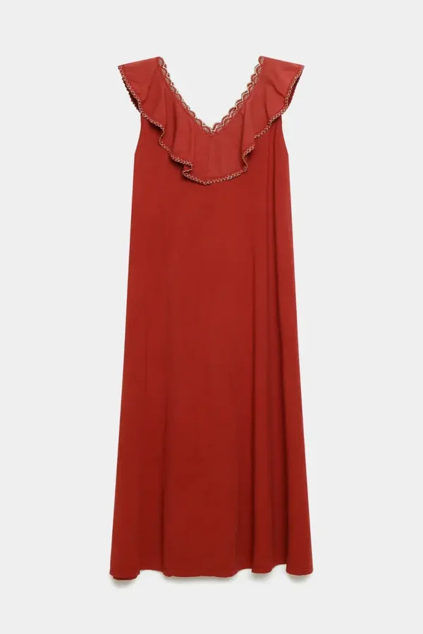 Tejido de algodón. Diseño midi. Manga sisa. Escote pico. Detalle volantes bordados.