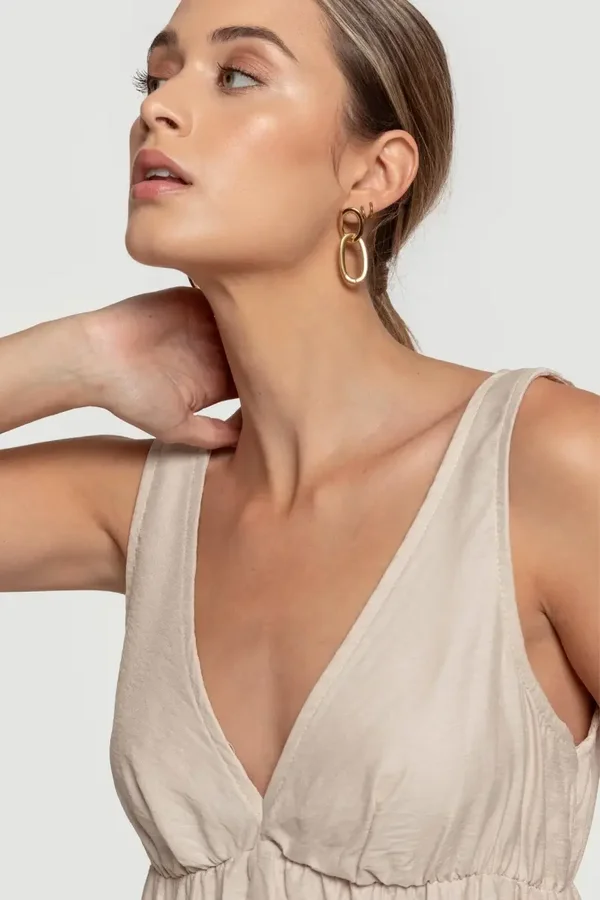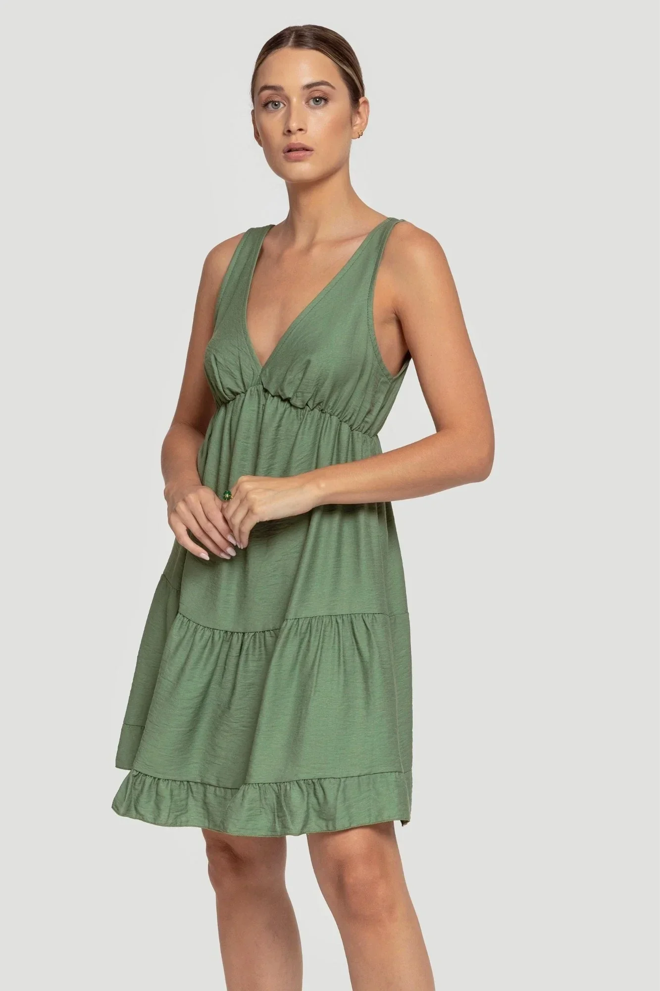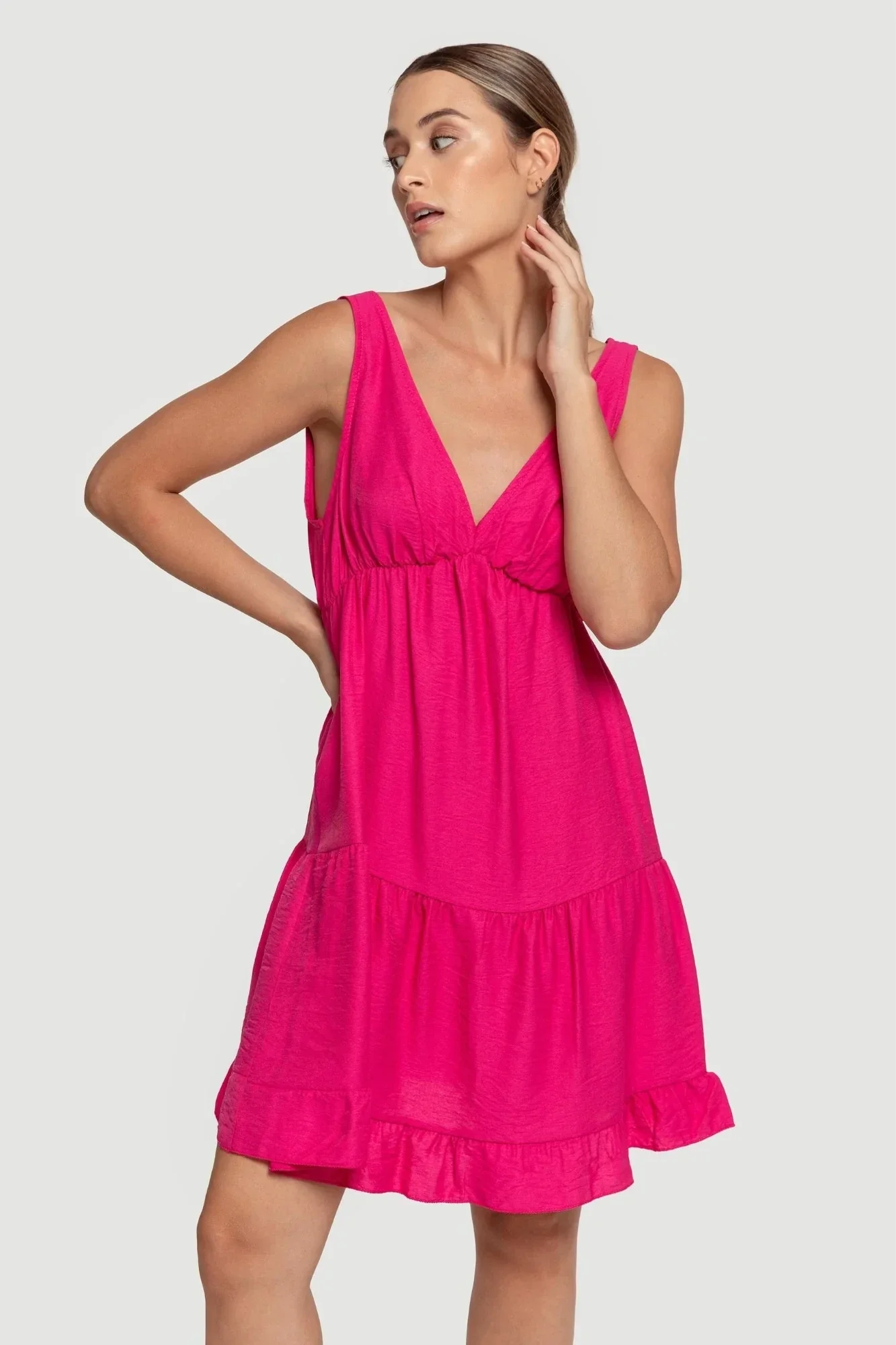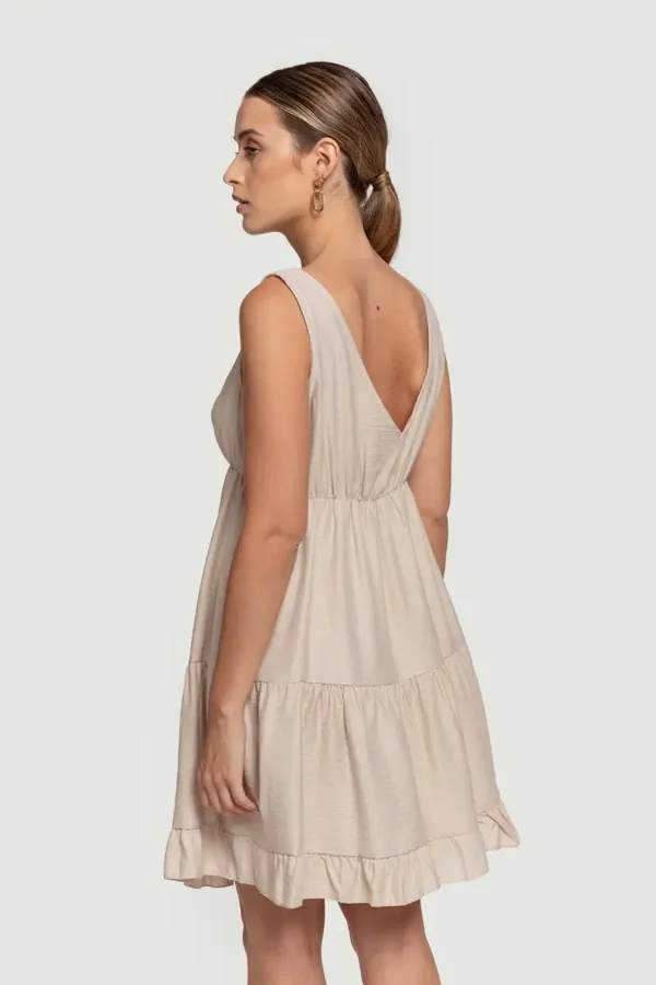 Vestido corto. Diseño amplio. Diseño volante. Diseño escotado. Sin mangas. Elástico bajo el pecho. Talla modelo: S. Altura modelo 1.66 m.