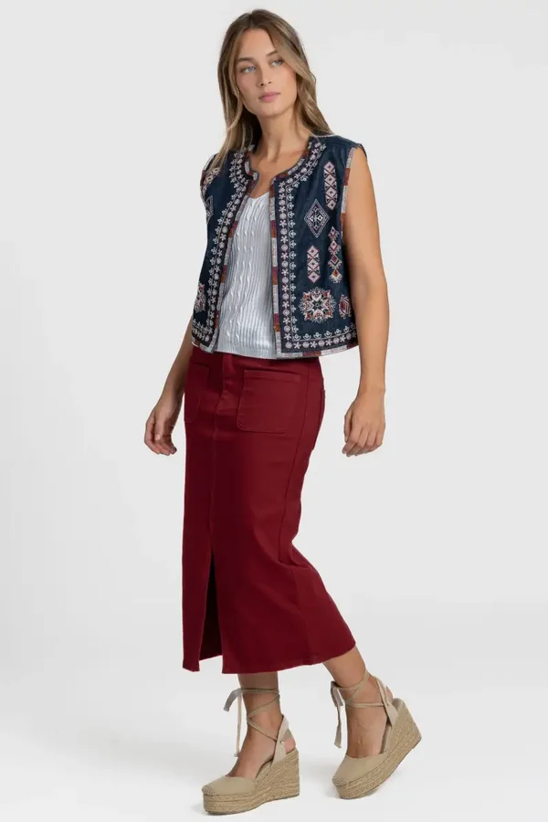 Tejido denim. Cuello redondo. Manga sisa. Diseño bordados.