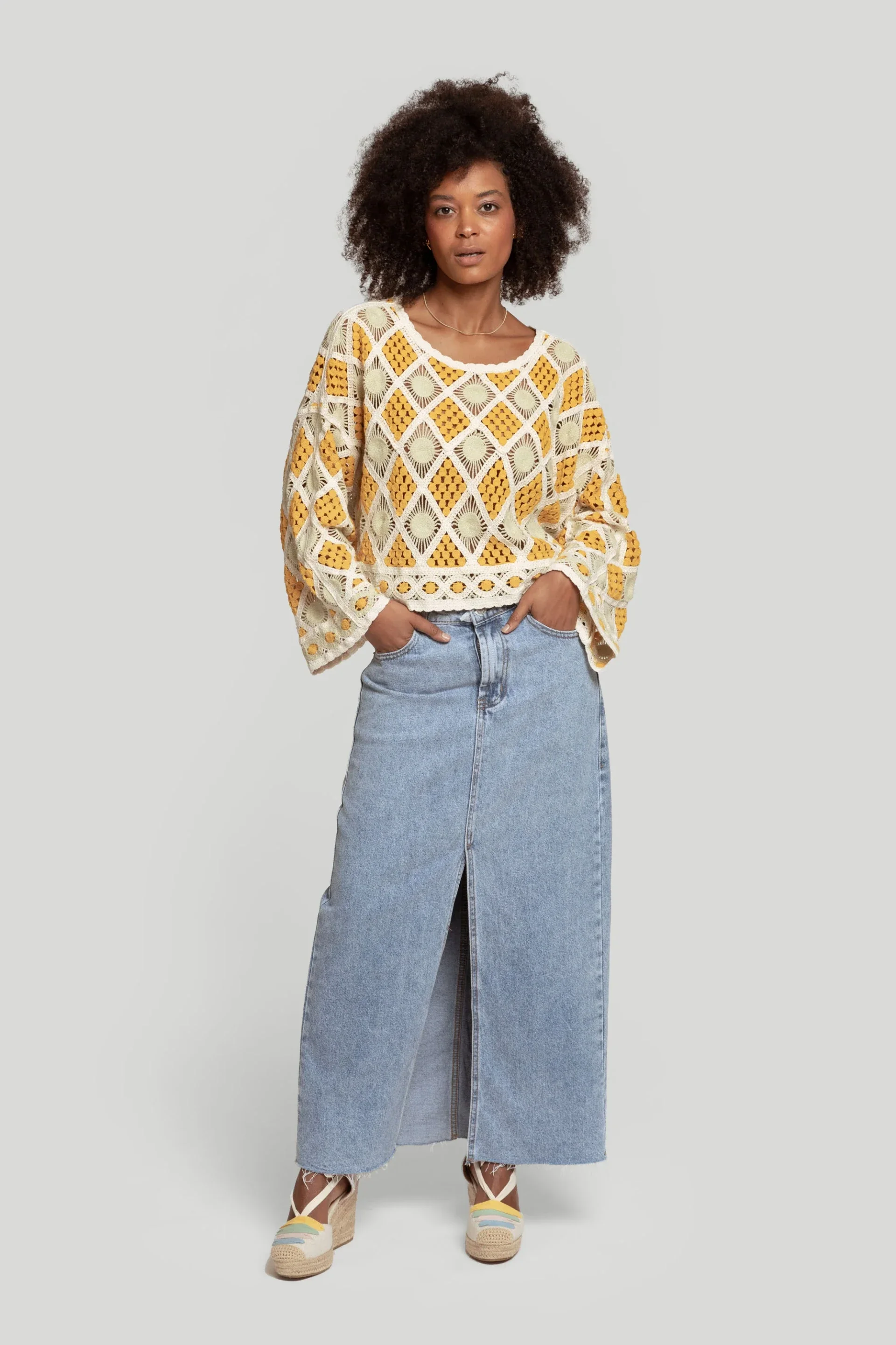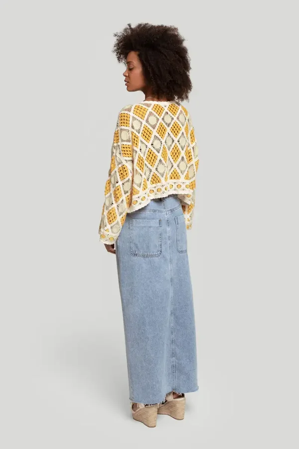 Tejido mezcla de algodón. Estilo tejano vaquero. Diseño largo. Diseño recto. Tiro alto. Cinco bolsillos. Cierre de cremallera y botón. Trabillas. Bajo con abertura frontal. Bajo sin rematar. Talla modelo: 36. Altura modelo 1,75 m.