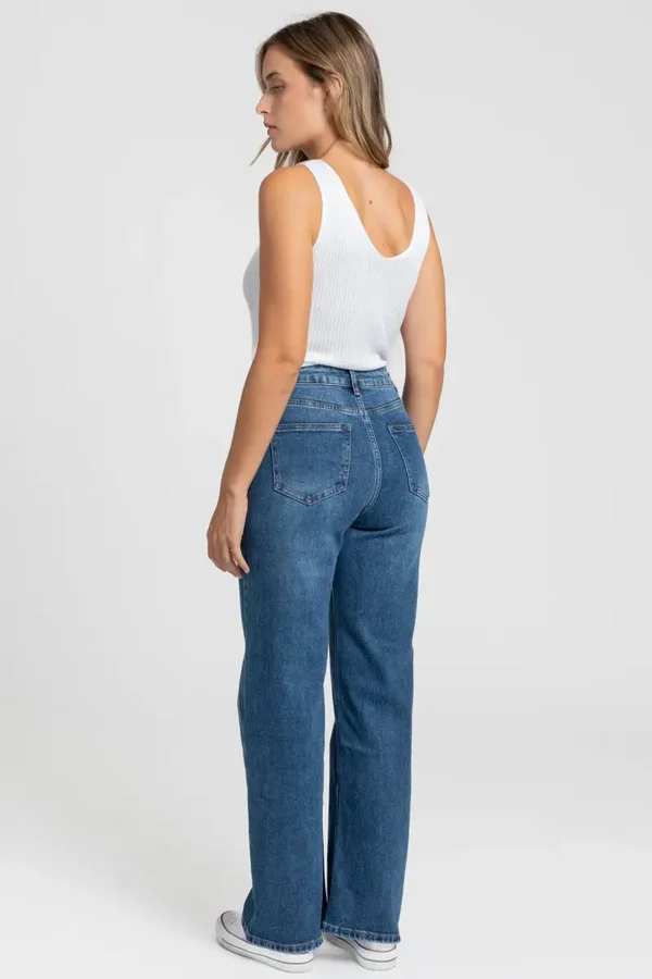 Tejido mezcla de algodón. Tejido tejano vaquero. Diseño recto. Diseño largo. Tiro alto. Cinco bolsillos. Cierre de cremallera y botón. Trabillas. Detalle botones asimétricos.