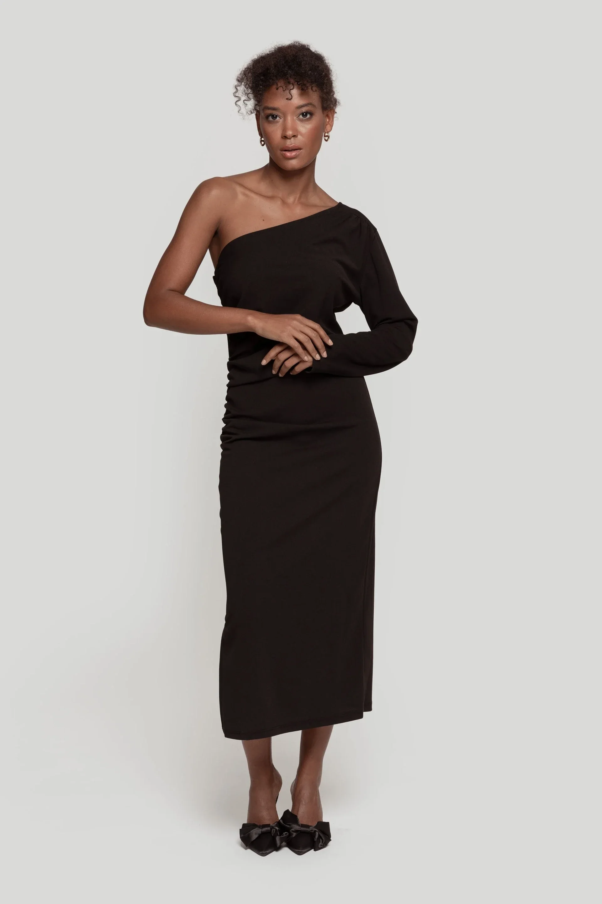 Tejido elástico. Diseño recto. Diseño entallado. Diseño midi. Diseño frunce. Cuello asimétrico. Manga larga. Abertura lateral. Talla modelo: S. Altura modelo 1,65 m.