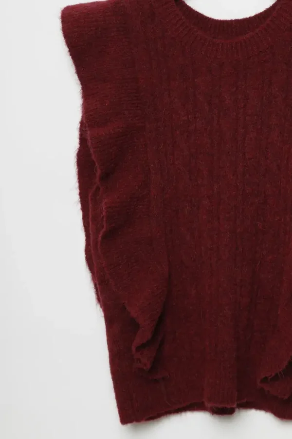 Tejido de punto. Tejido con lana. Diseño recto. Diseño volantes. Cuello redondo. Manga sisa. Talla modelo: S Altura modelo: 1,75 m.