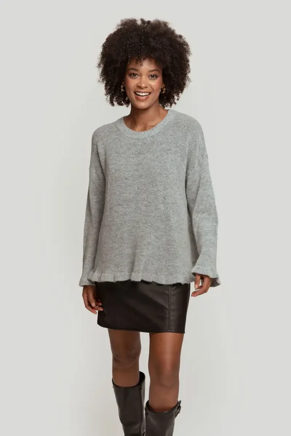 Tejido de punto. Diseño amplio. Diseño recto. Cuello redondo. Manga larga. Terminaciones volante. Acabado pelitos. Talla modelo: S Altura modelo: 1,66 m.
