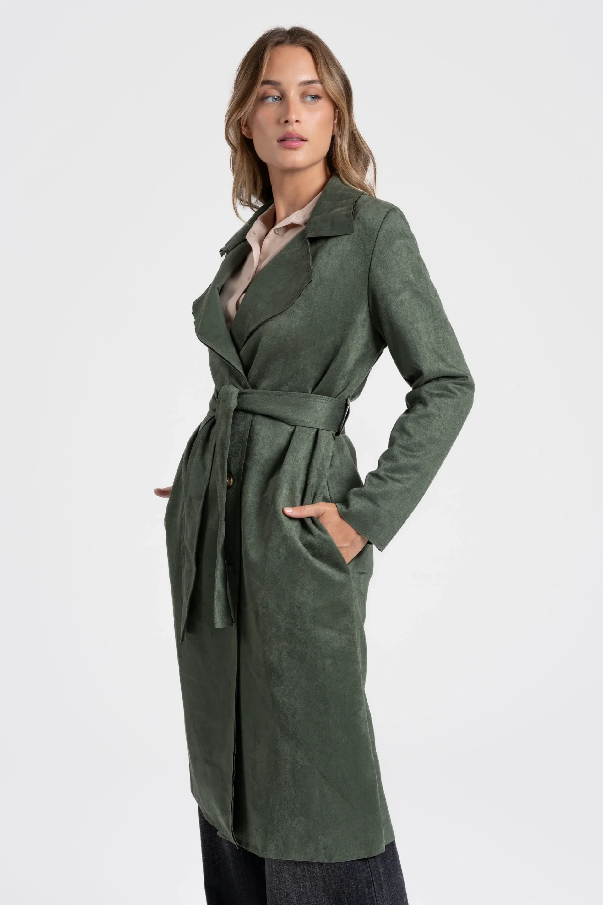 Trench de cuello solapa y manga larga. Bolsillos delanteros de vivo. Cierre frontal cruzado con botones y cinturón del mismo tejido.