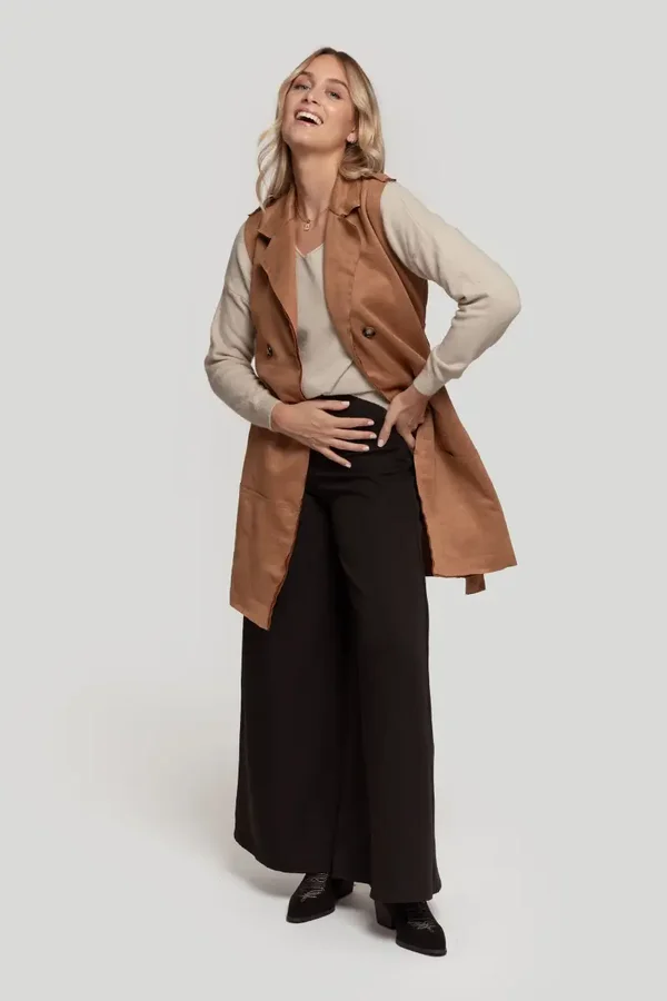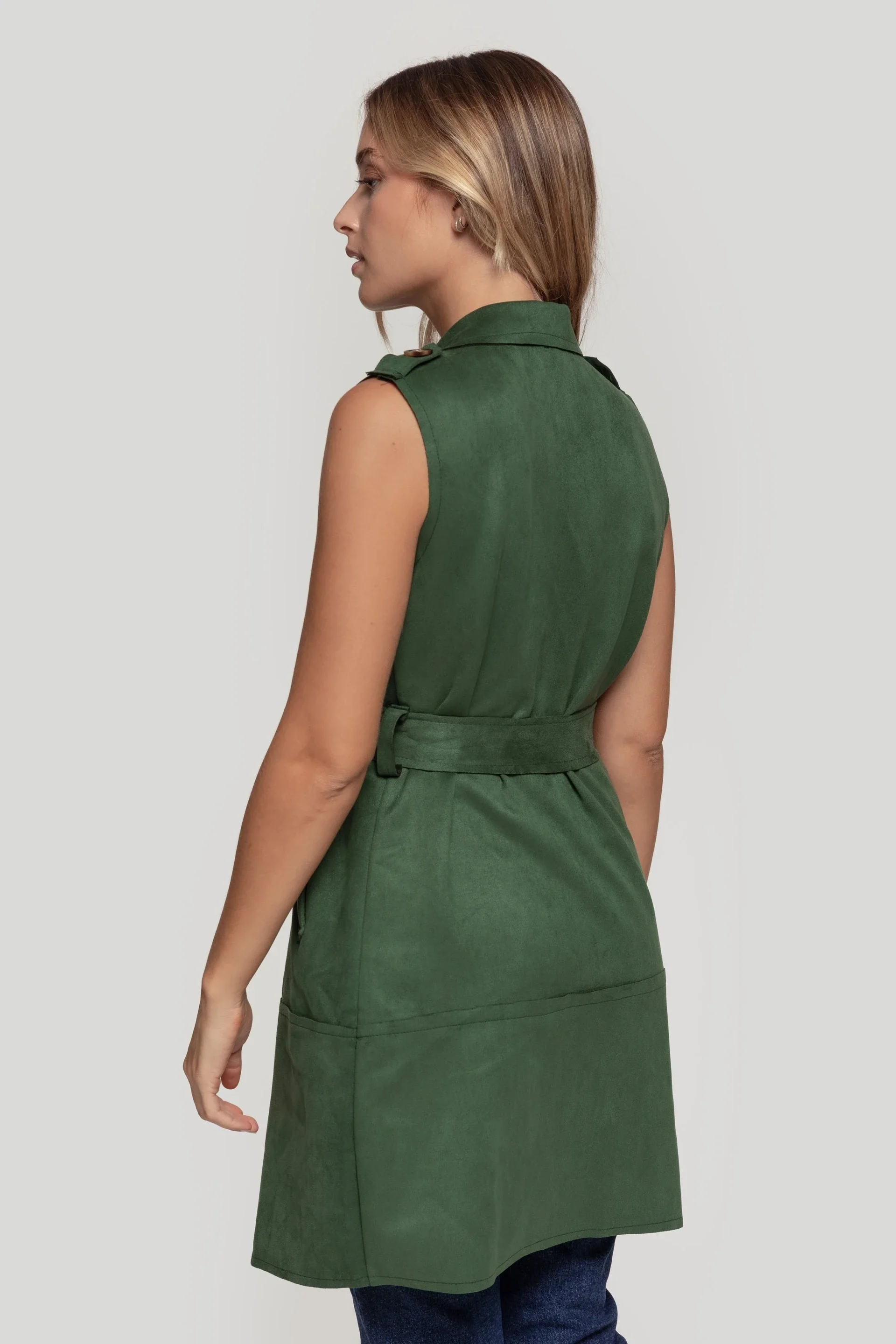 Tejido ante. Diseño midi. Diseño cruzado. Manga sisa. Cierre de botones. Terminaciones sin rematar. Talla modelo: S. Altura modelo: 1,66 m.