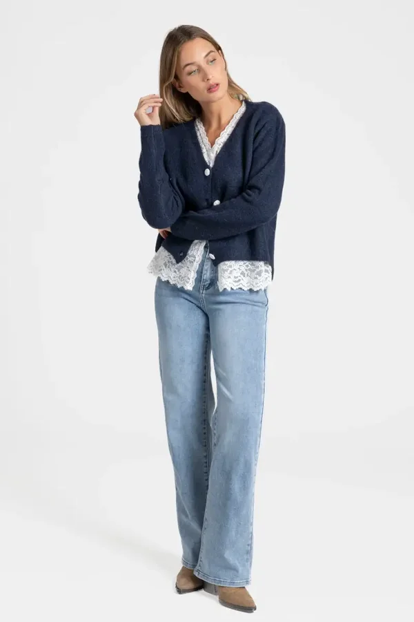 Tejido punto. Escote pico. Efecto doble. Detalle encaje. Cierre con botones.