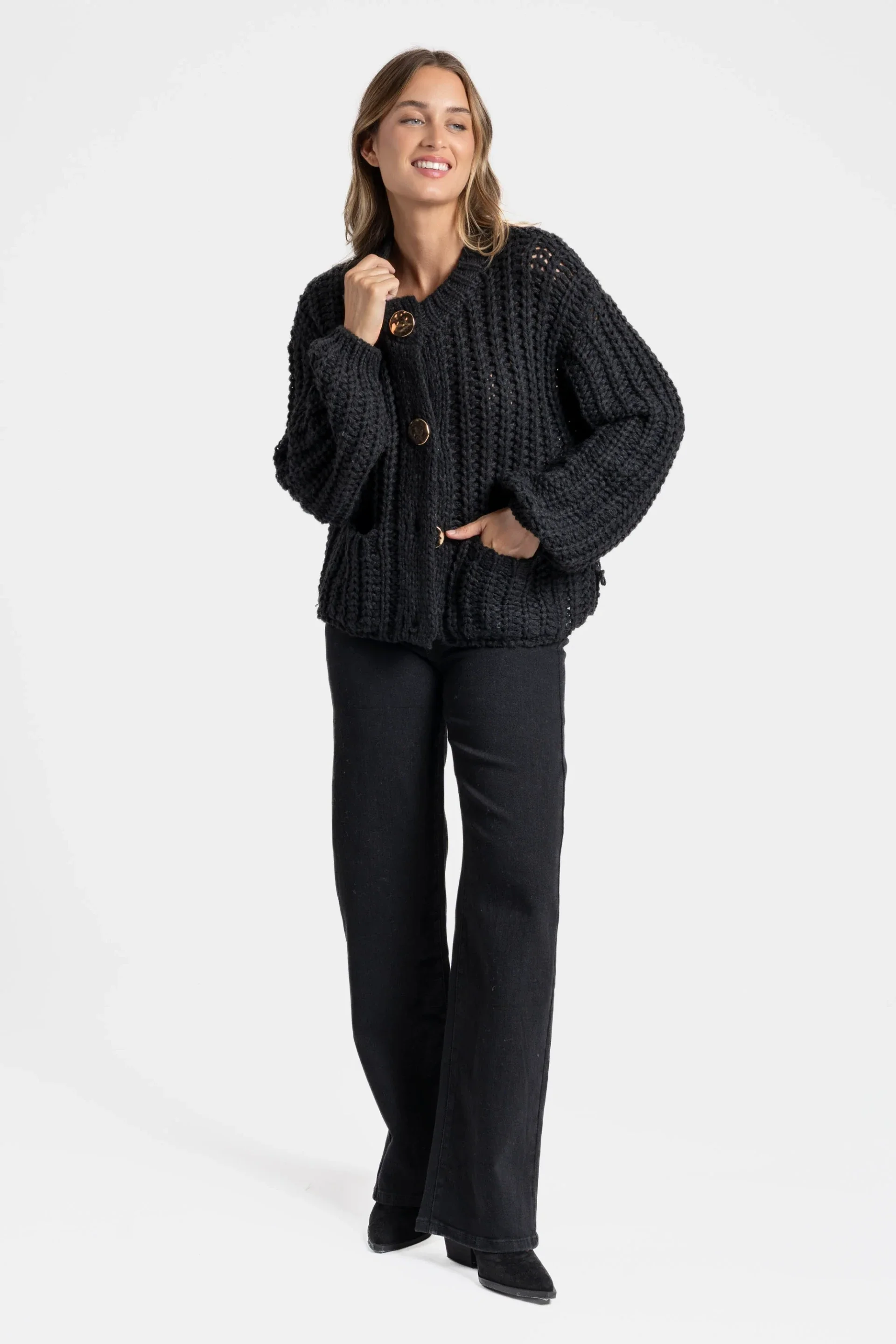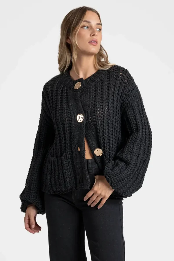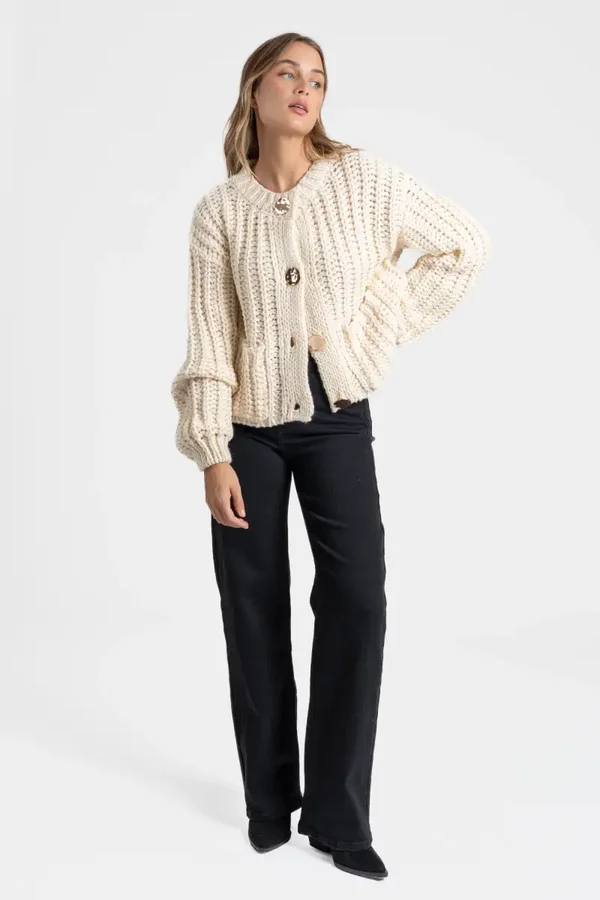 Punto grueso. Manga larga. Bolsillos frontales. Cierre con botones metálicos.