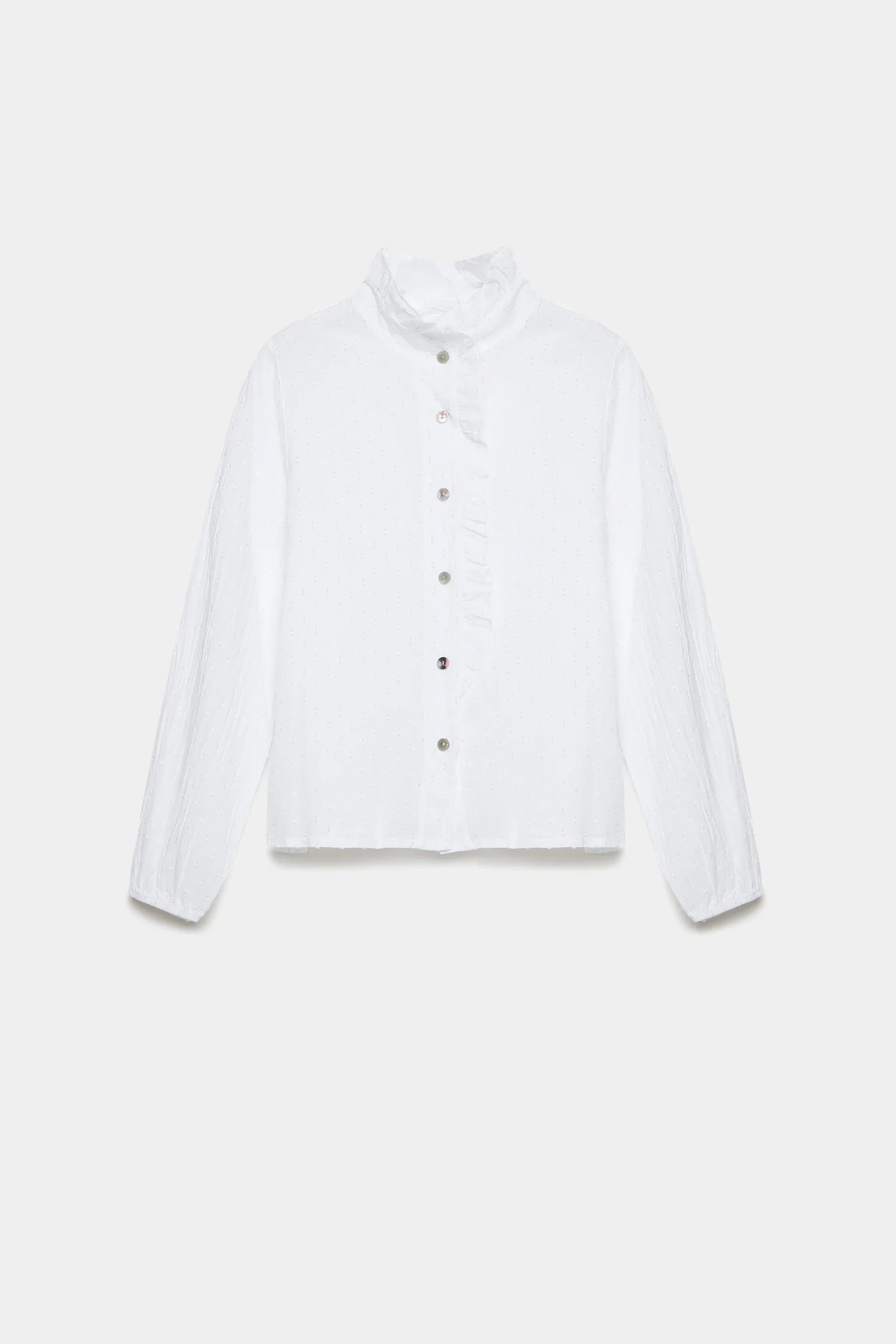 Tejido plumeti. Cuello redondo subido. Manga larga. Cierre de botones. Detalle de brillos.