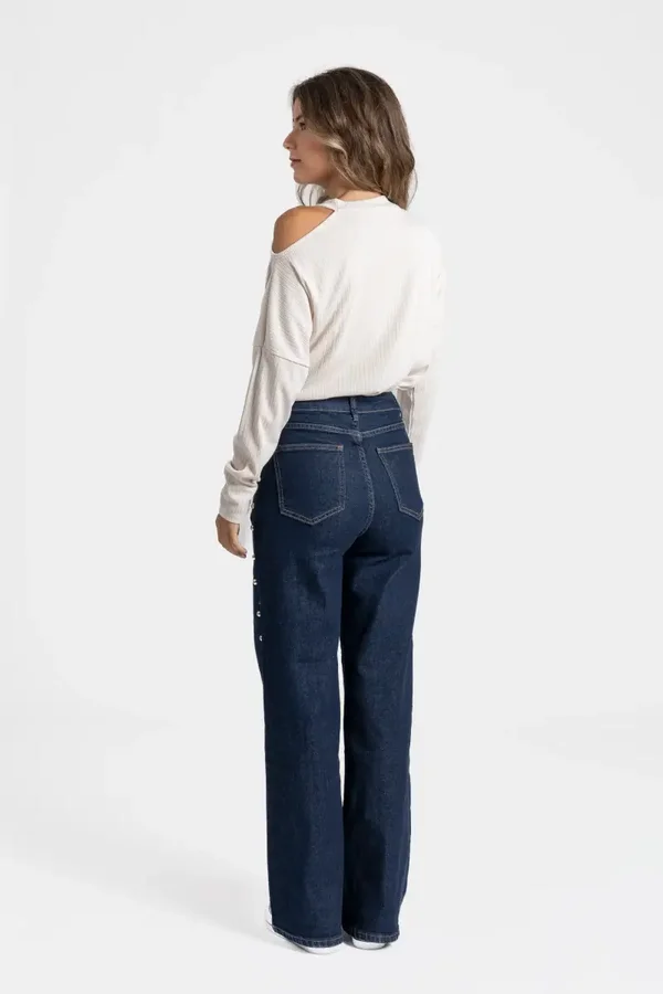 Tejido mezcla de algodón. Estilo tejano vaquero. Diseño recto. Tiro medio. Cinco bolsillos. Cierre de cremallera y botón. Trabillas. Detalle tachuelas.