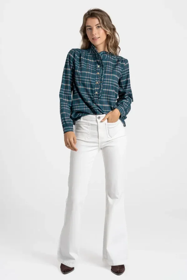 Tejido de algodón. Diseño estampado. Diseño largo. Cuello redondo. Manga larga. Puño abotonado. Cierre de botones en la parte superior.