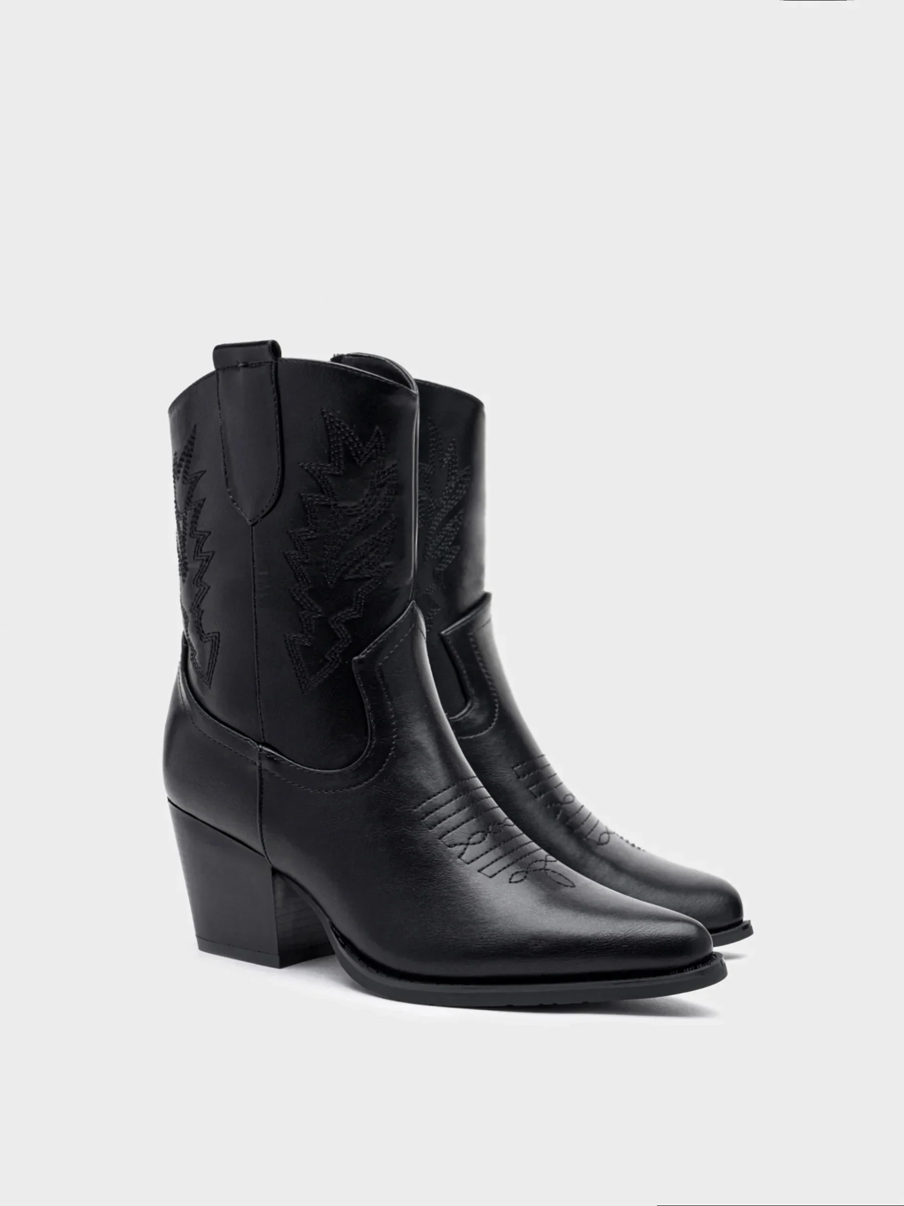 Botines estilo cowboy polipiel negro. Detalle de tiradores en caña y cosido. Se recomienda pedir una talla más.