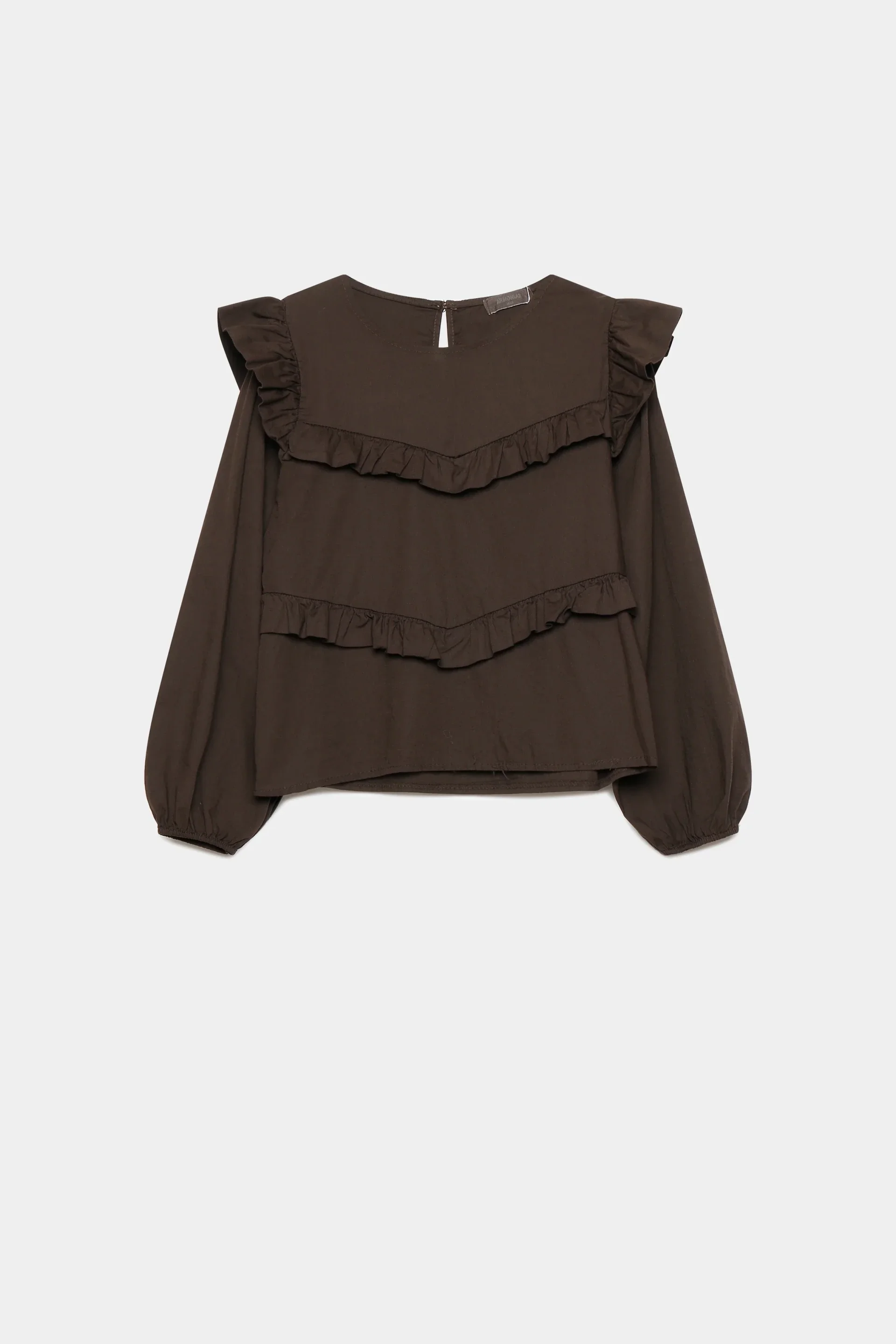Tejido de algodón. Cuello redondo. Manga larga. Detalle de volantes.