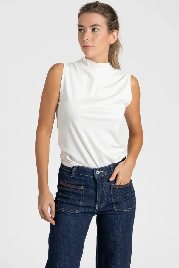 Tejido mezcla algodón. Tiro alto. Cuatro bolsillos. Diseño largo. Pernera ancha.