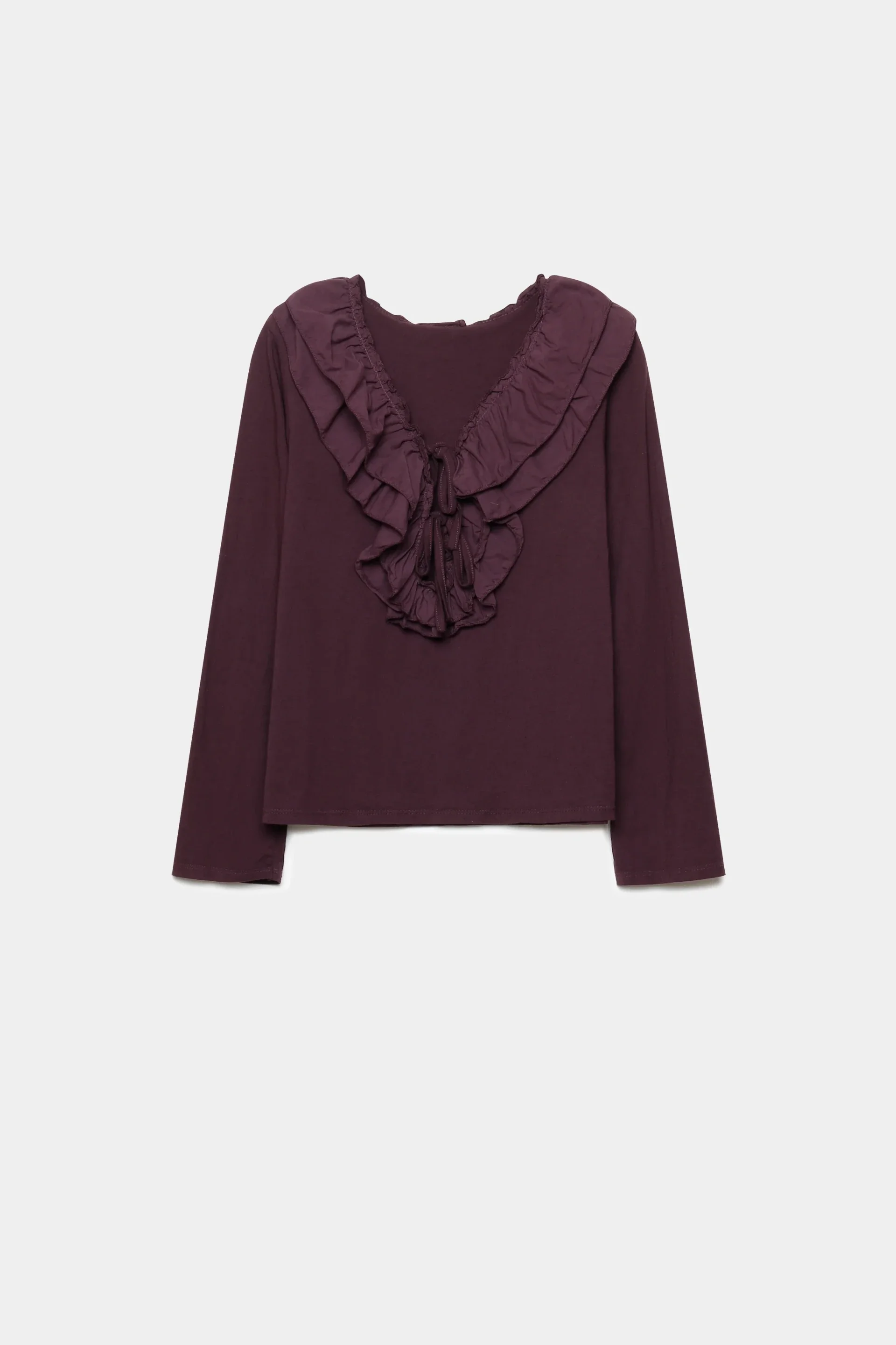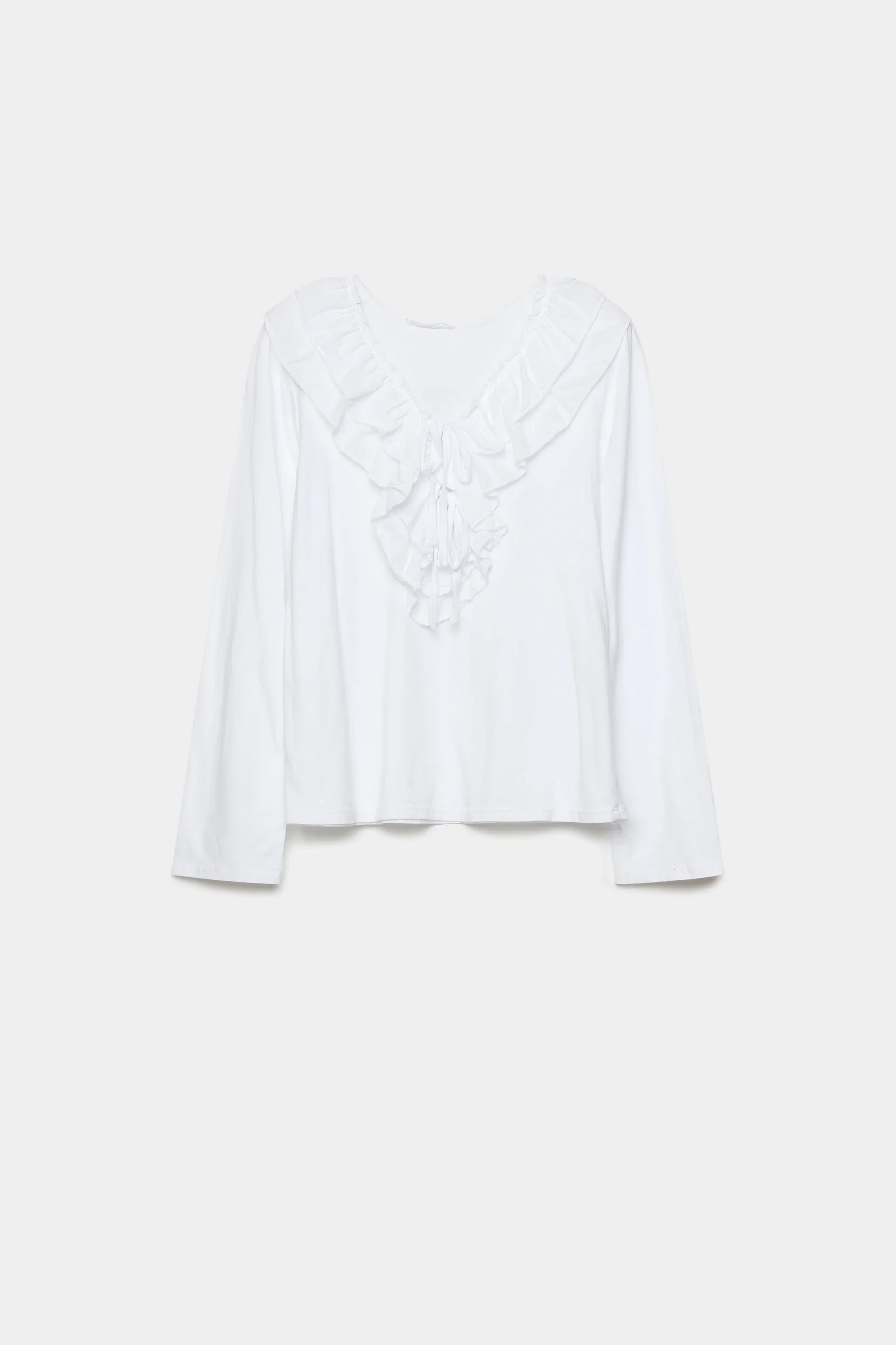 Tejido de algodón. Escote pico. Manga larga. Detalle volantes.