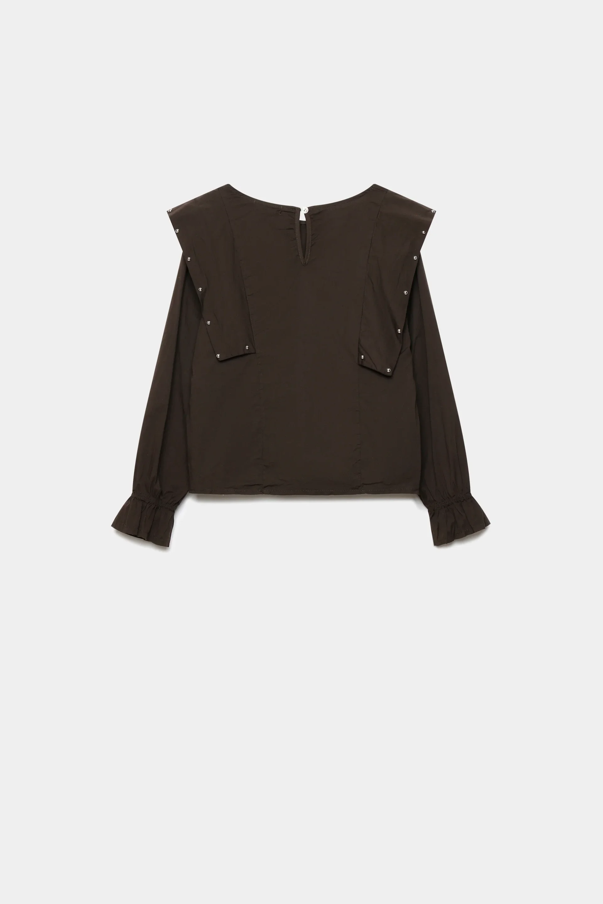 Tejido de algodón. Cuello redondo. Manga larga. Cierre de botón en el cuello. Detalle de tachuelas.